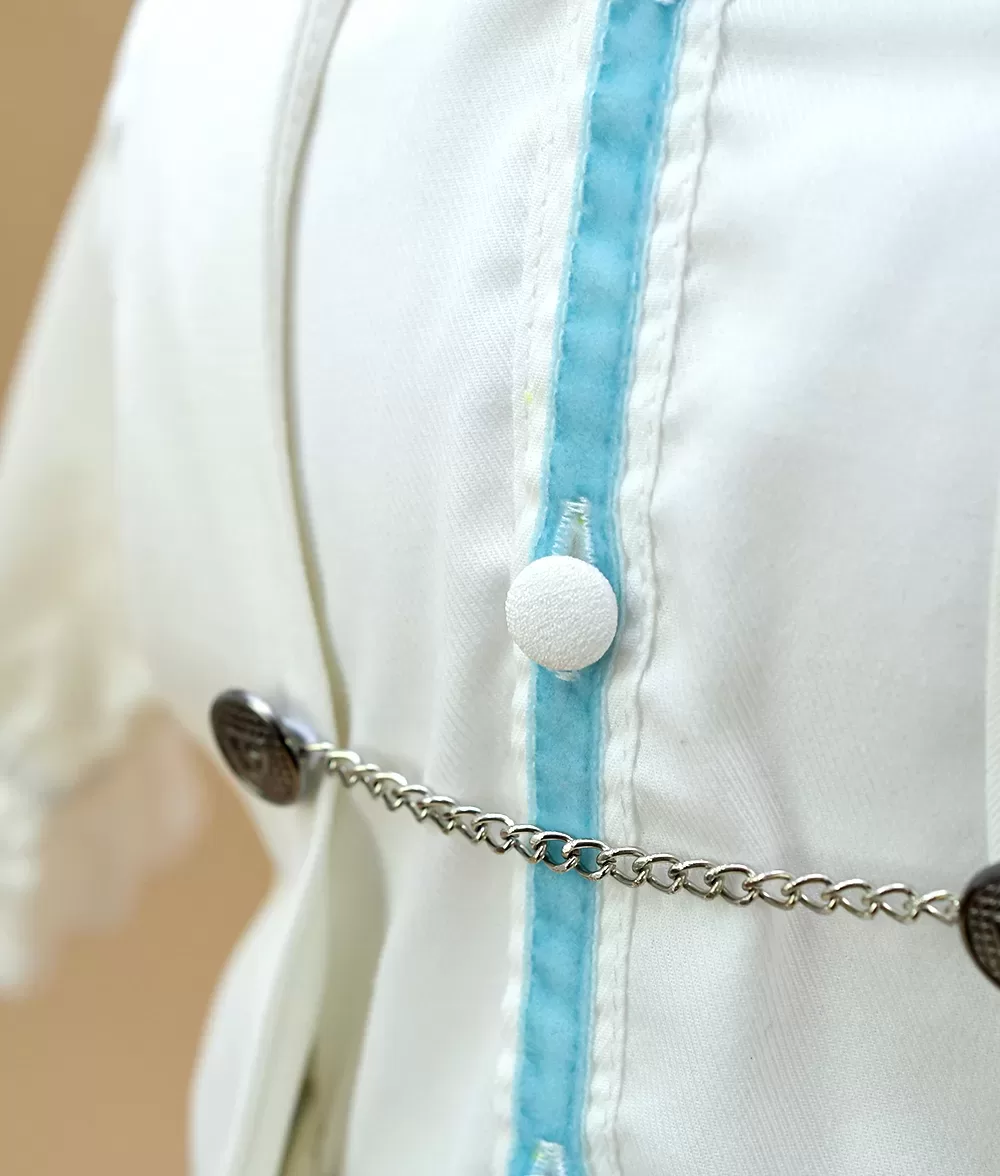Camasa alba cu volane si detalii din catifea bleu este tip body din bumbac moale, sistemul de inchidere este cu nasturi imbracati in stofa. Tinuta este completata armonios de lantul metalic de la vesta si de accentele de catifea bleu.
