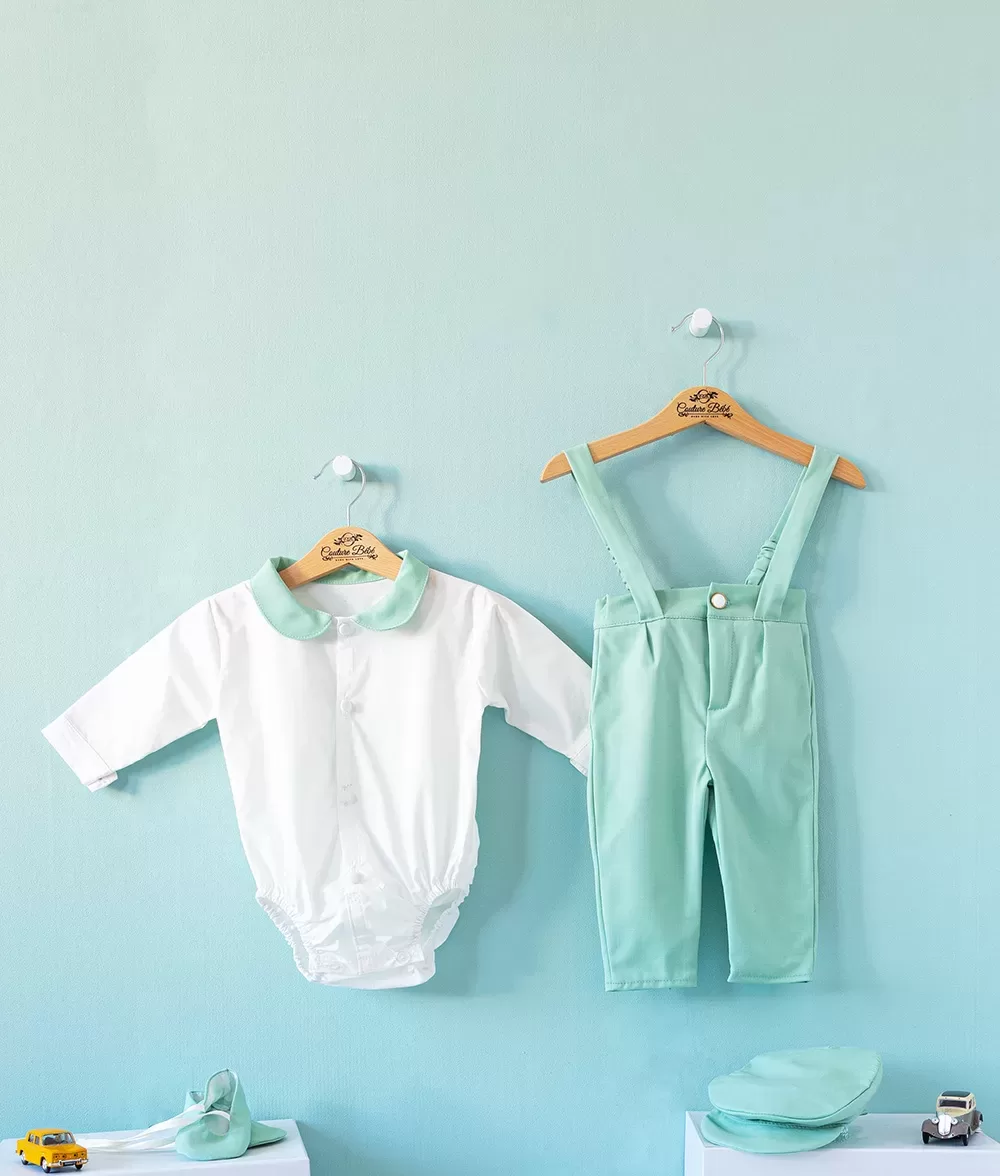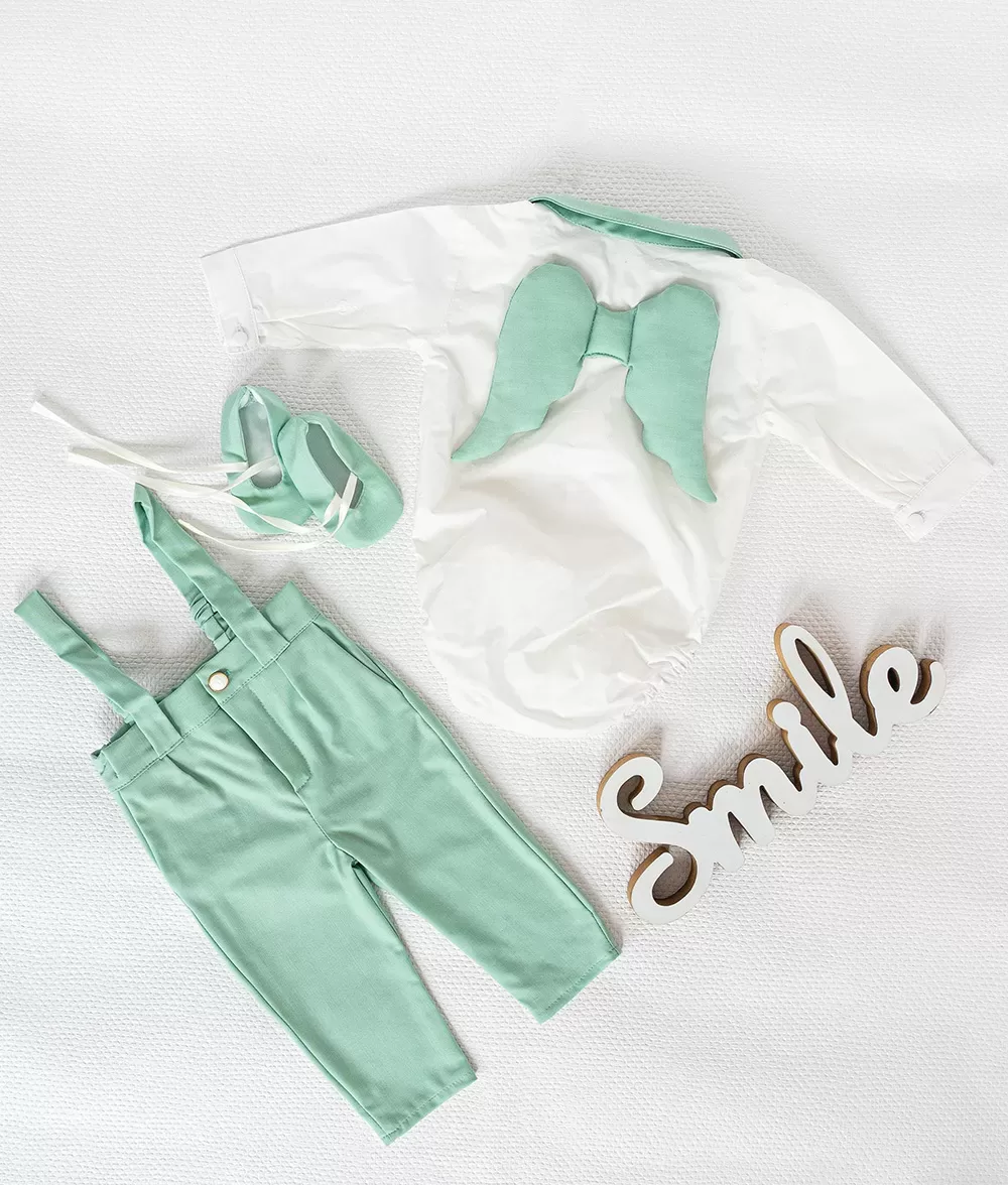 Costumul „ingeras” pentru botez, creat de Couture Bebe, reprezintă o alegere deosebită pentru evenimentele importante din viața copilului dumneavoastră. Realizat dintr-o stofă de cea mai înaltă calitate, într-o nuanță elegantă de verde mint, acest costum impresionează prin atenția deosebită acordată detaliilor și rafinamentului.