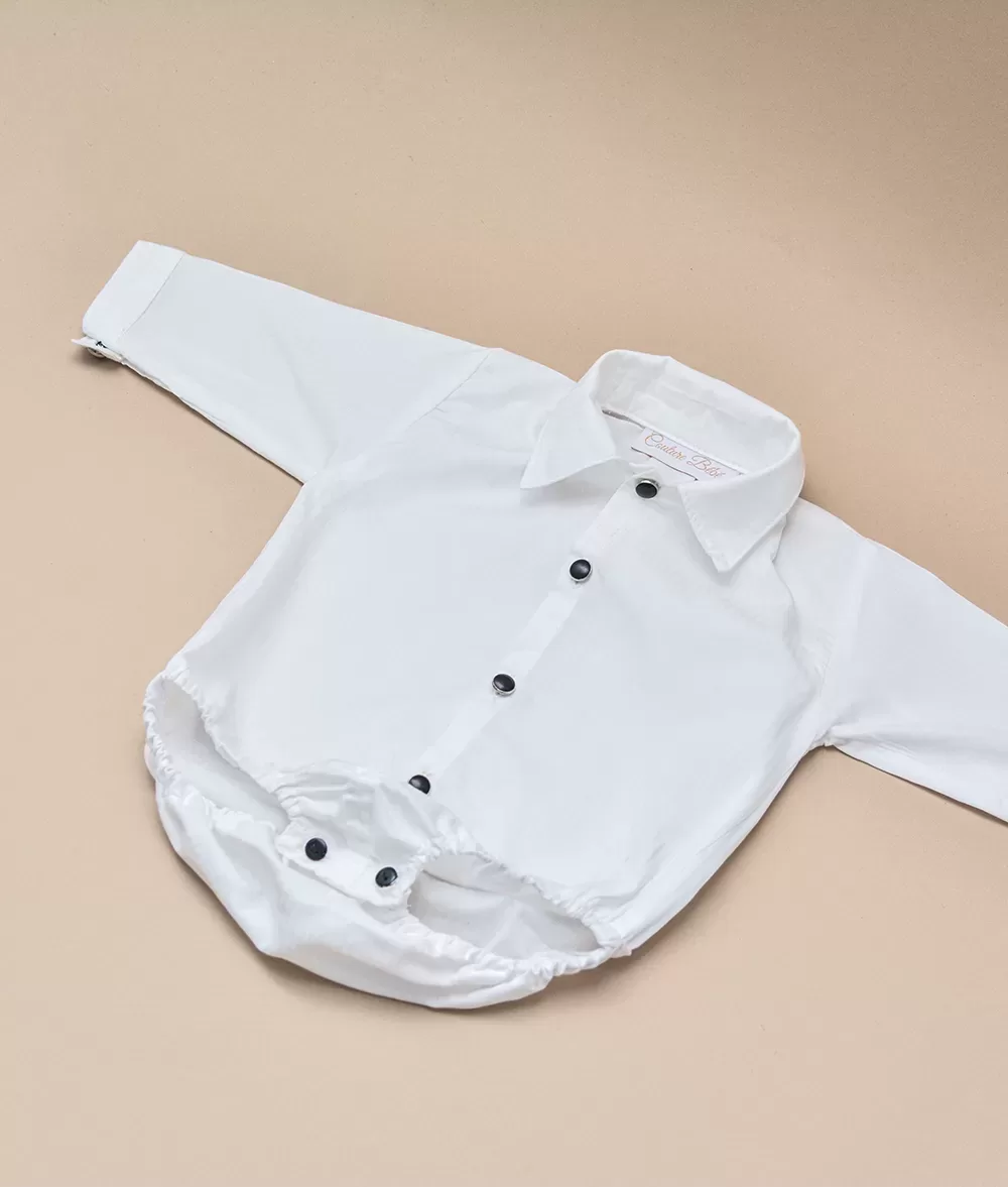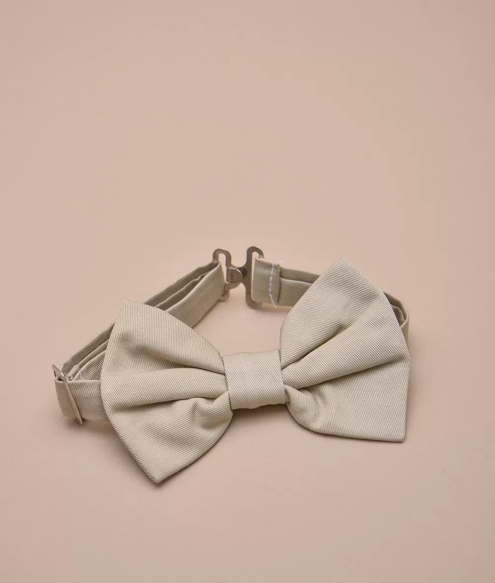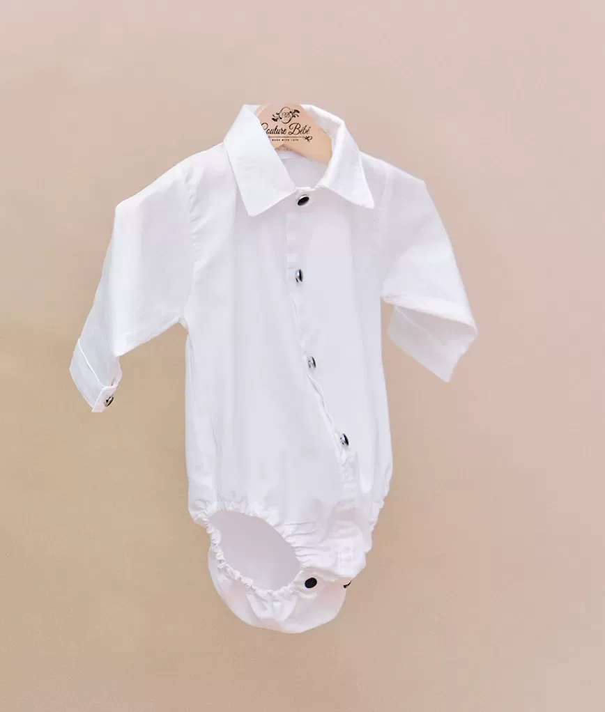 Camasa este tip body din bumbac moale cu dungi discrete, sistemul de inchidere este cu nasturi. Tinuta este completata armonios de papionul beige cu sistem de inchidere reglabil metalic.