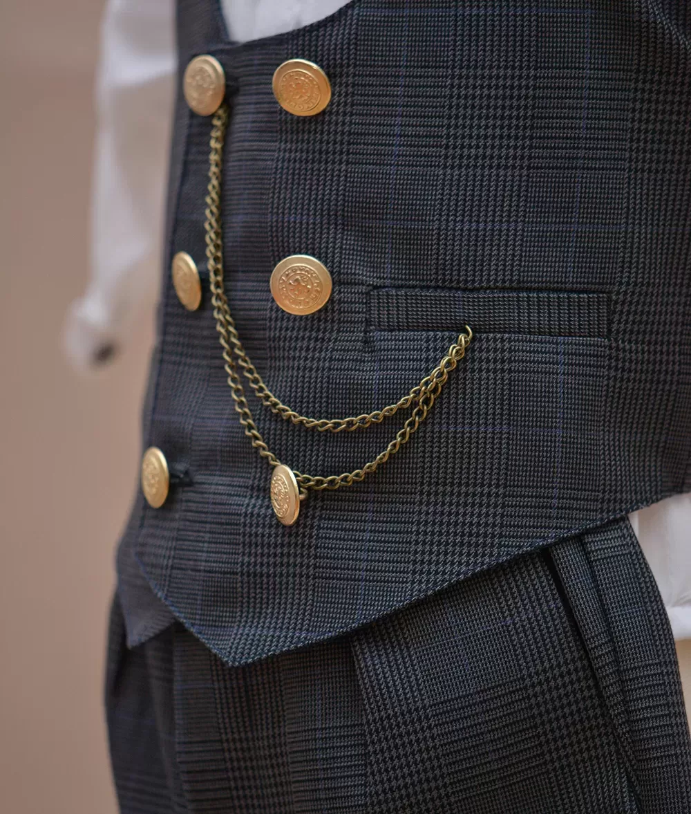 Sacoul, vesta si pantalonii au compozitie 100% stofa, sunt captusite cu material vegetal si au un sistem de inchidere cu nasturi. Pantalonii sunt croiti slim-fit, au buzunare, sistem de inchidere cu fermoar si elastic reglabil in talie pentru lejeritate.