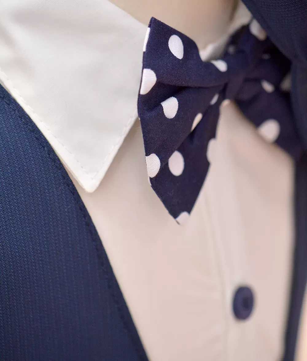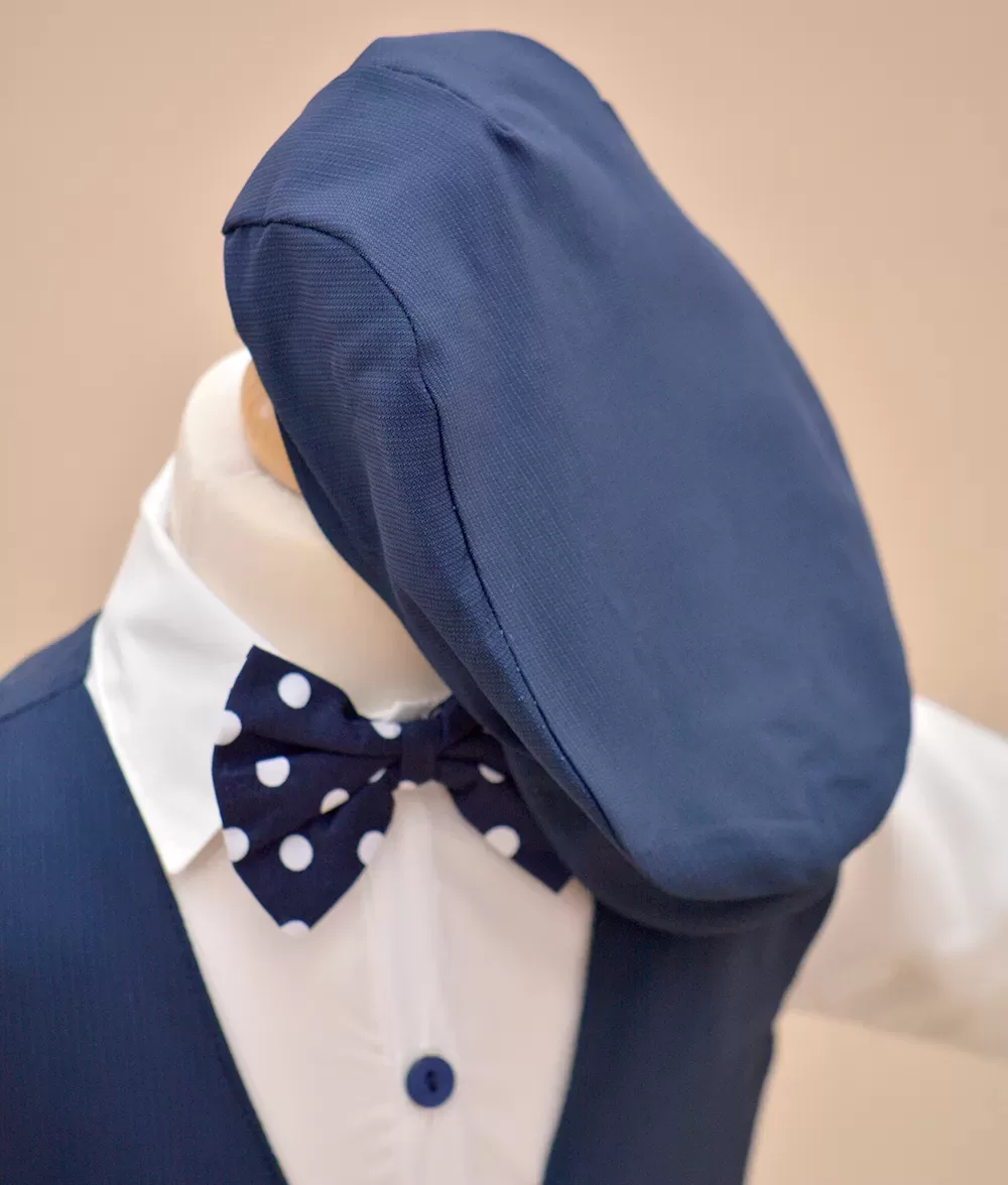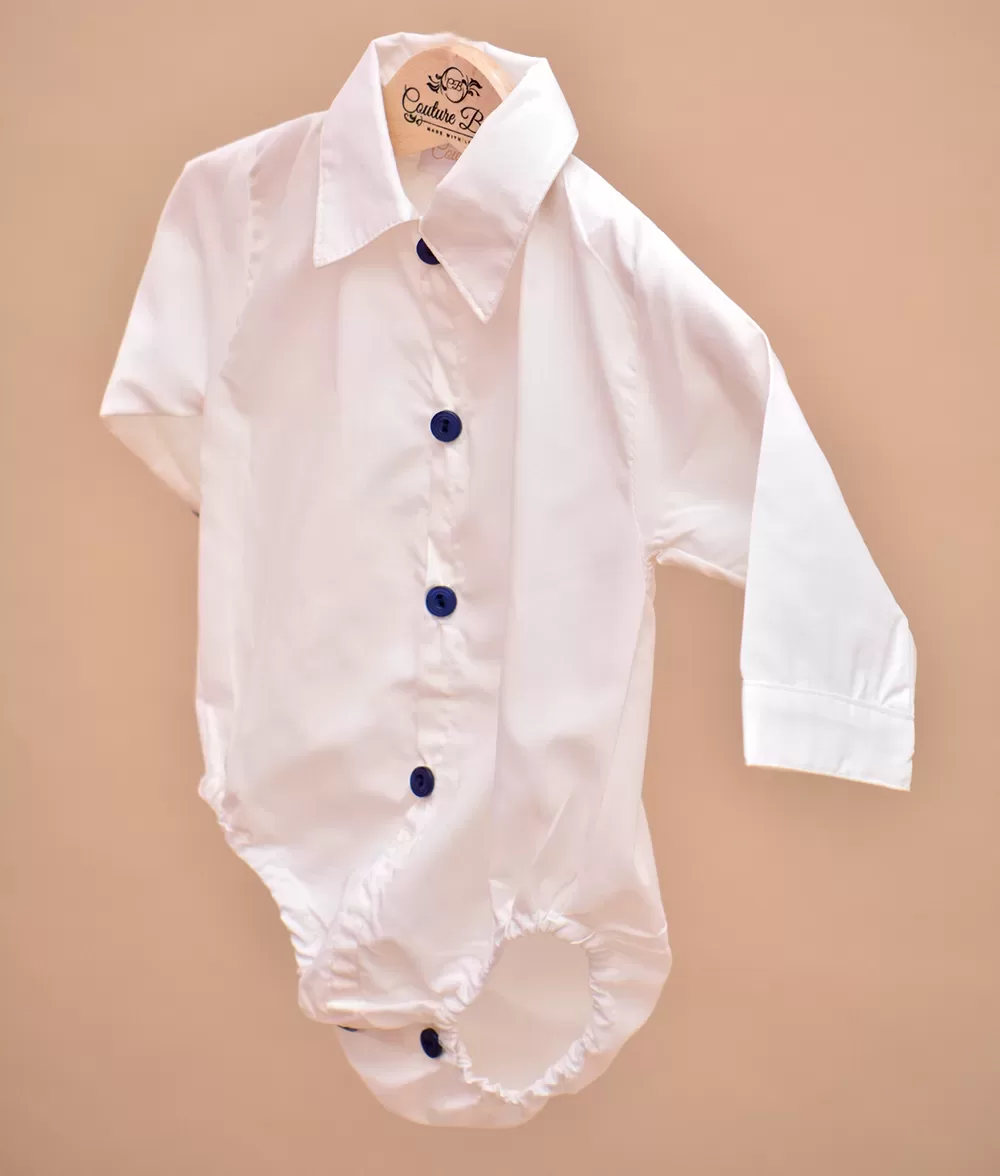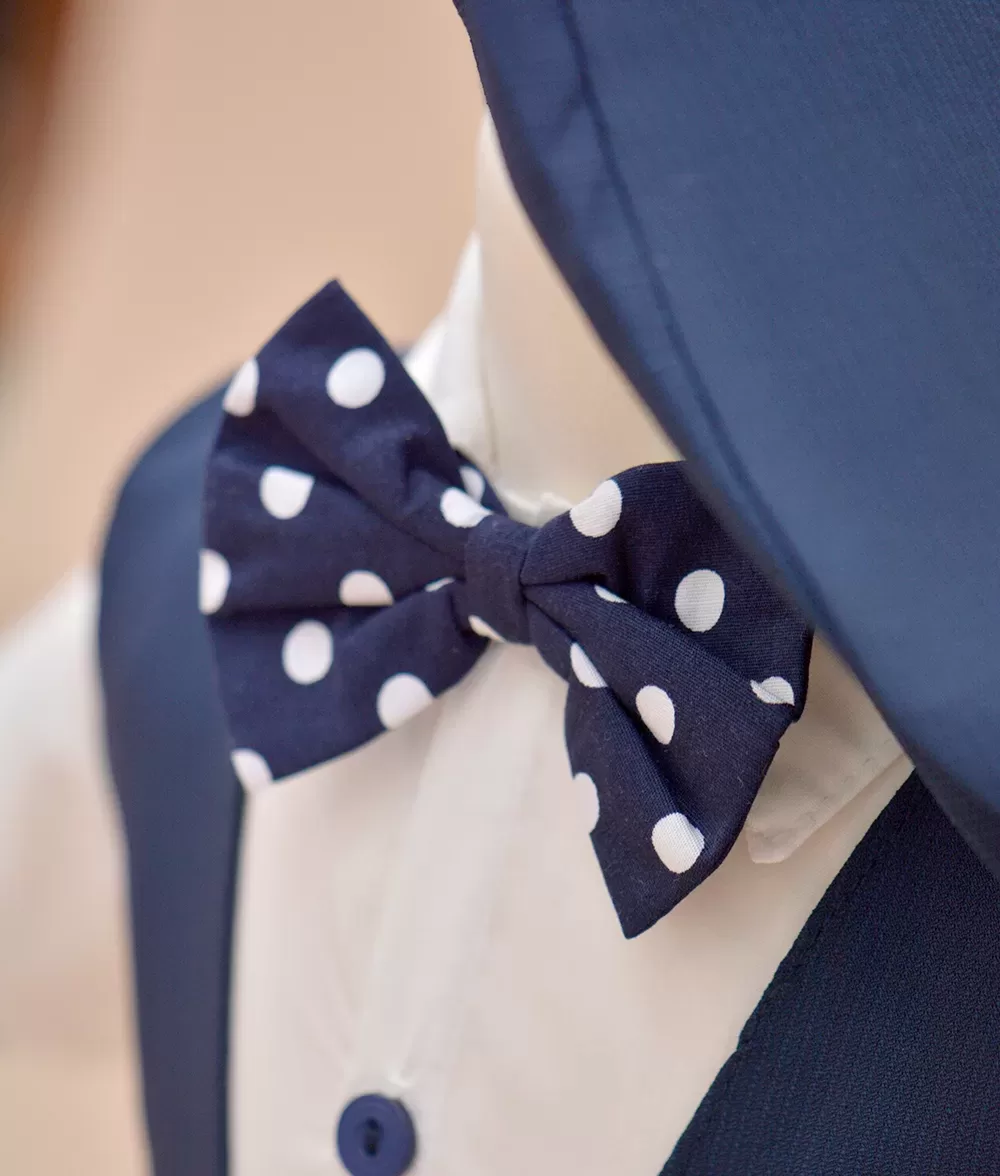 Camasa este tip body din bumbac moale, sistemul de inchidere este cu nasturi. Tinuta este completata armonios de papionul bleumarin cu buline albe cu sistem de inchidere reglabil metalic.