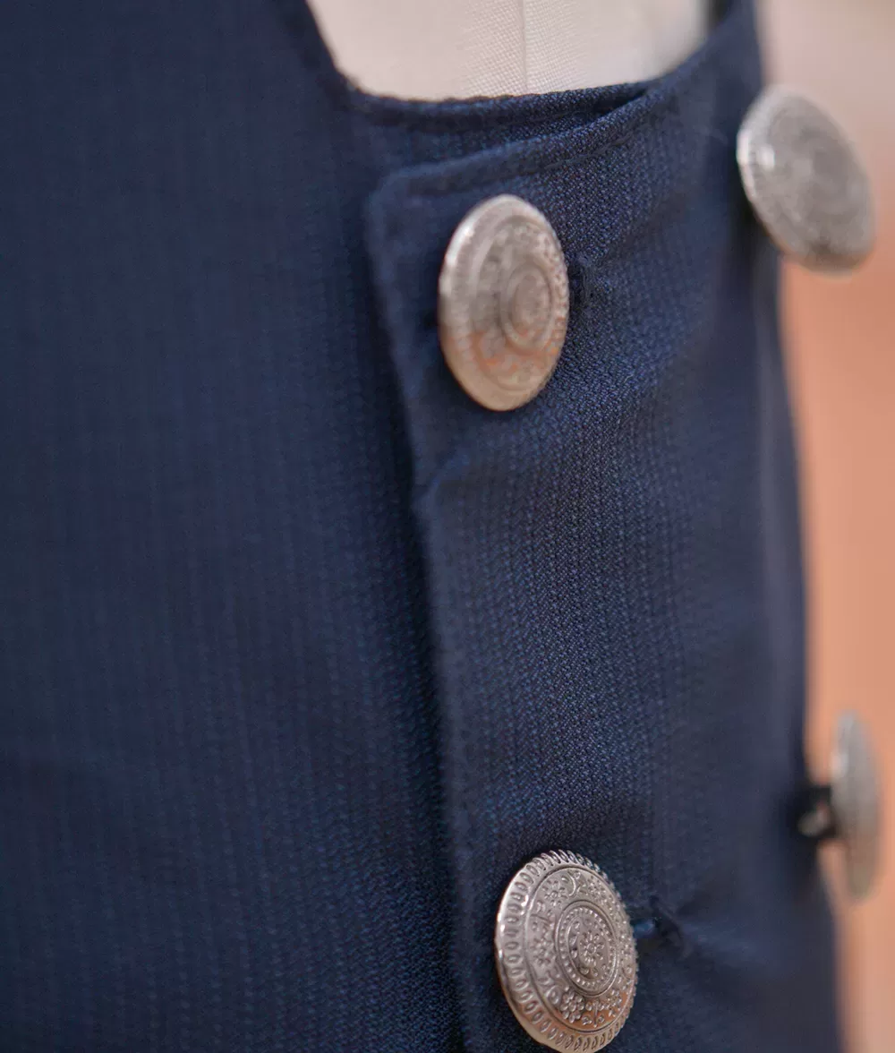 Vesta si pantalonii au compozitie 100% stofa. Pantalonii sunt croiti slim-fit, au buzunare, sistem de inchidere cu fermoar si elastic in talie pentru lejeritate.