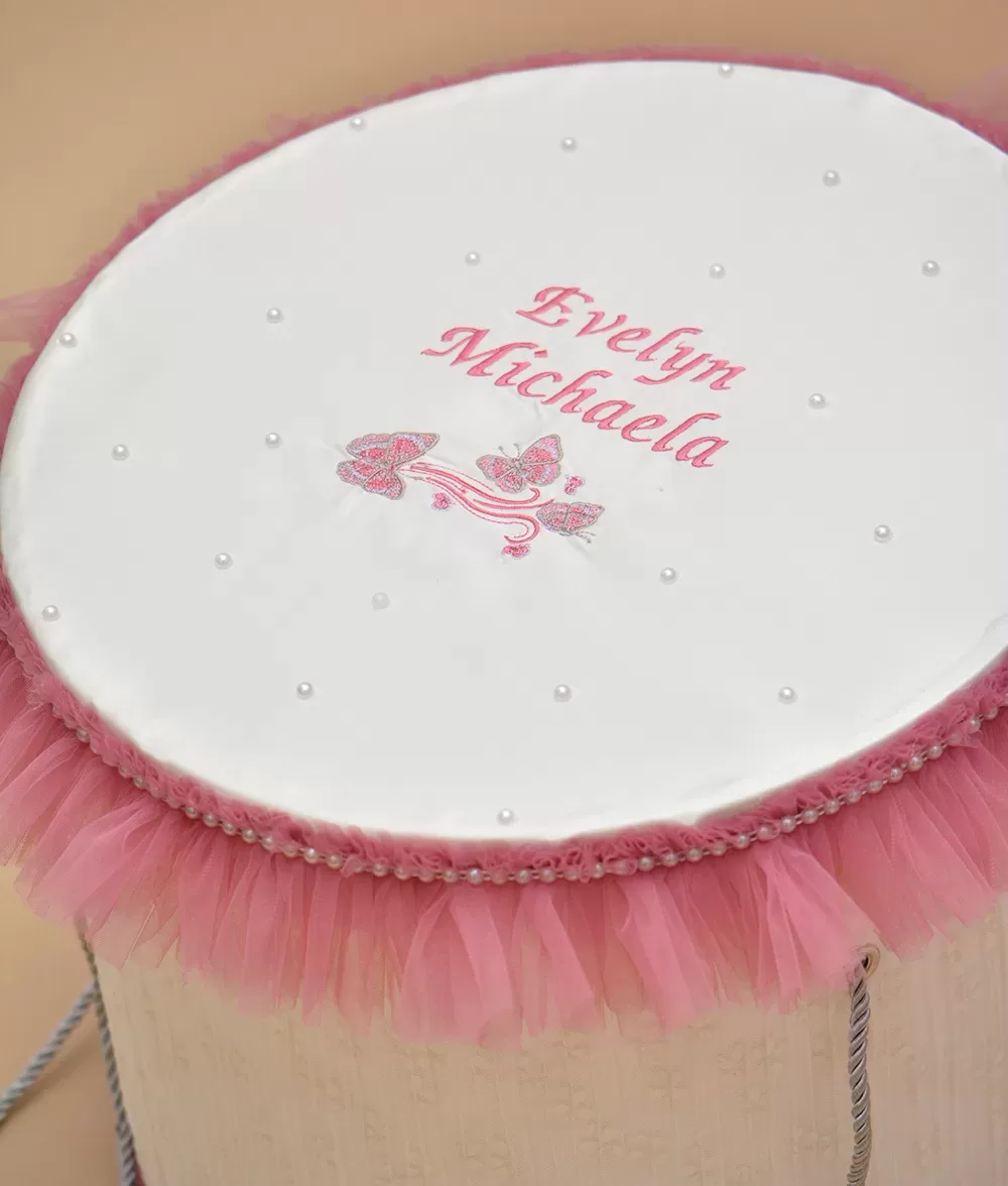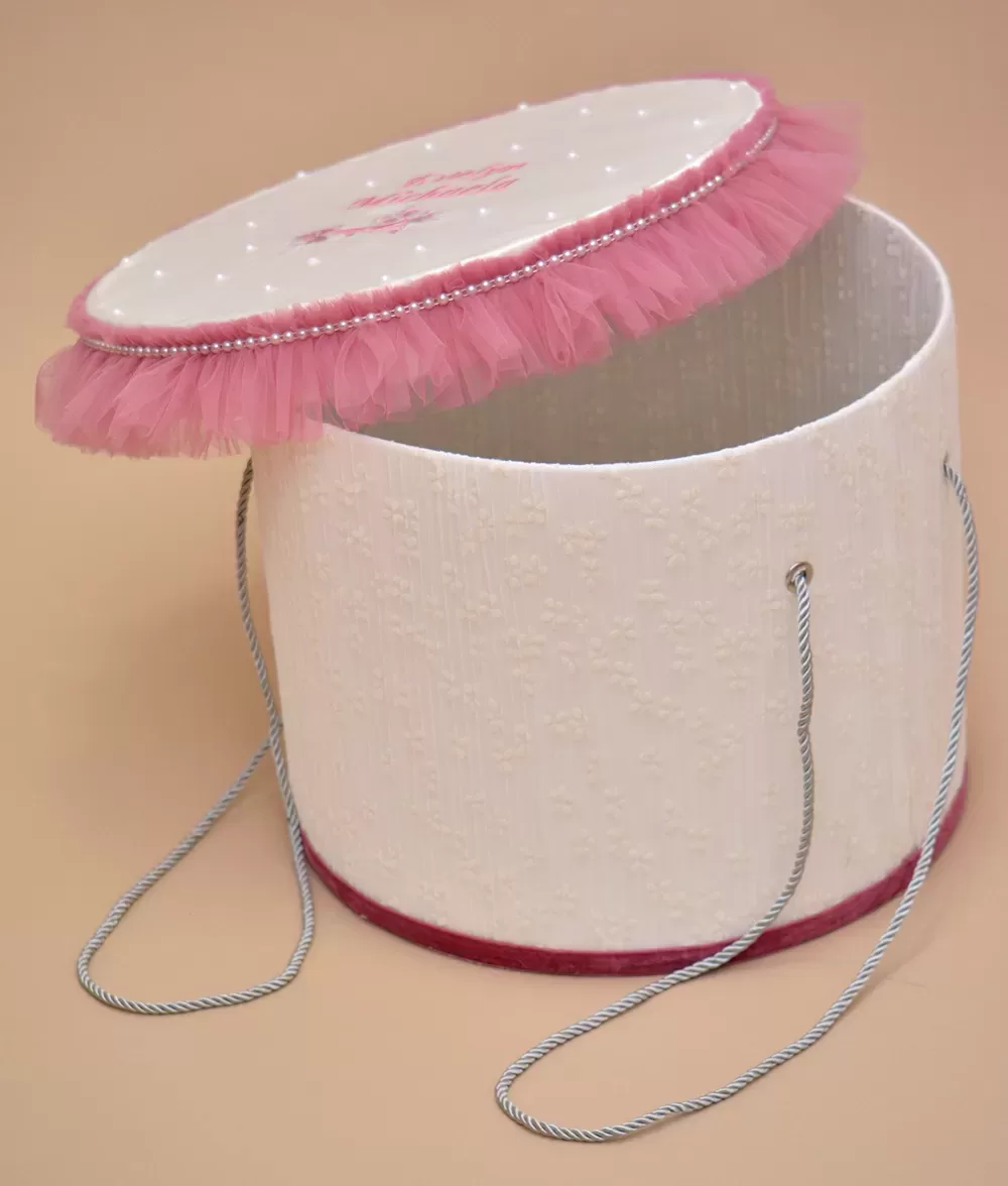 Cutie trusou botez roz model Michaela folosita pentru transportul trusoului de botez de acasa la biserica – Produs de Couture Bebe.