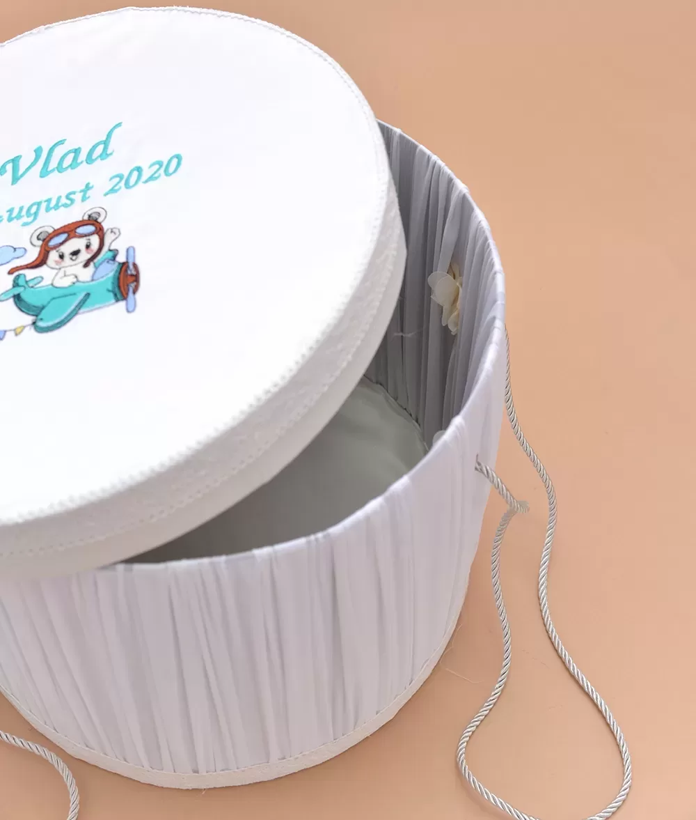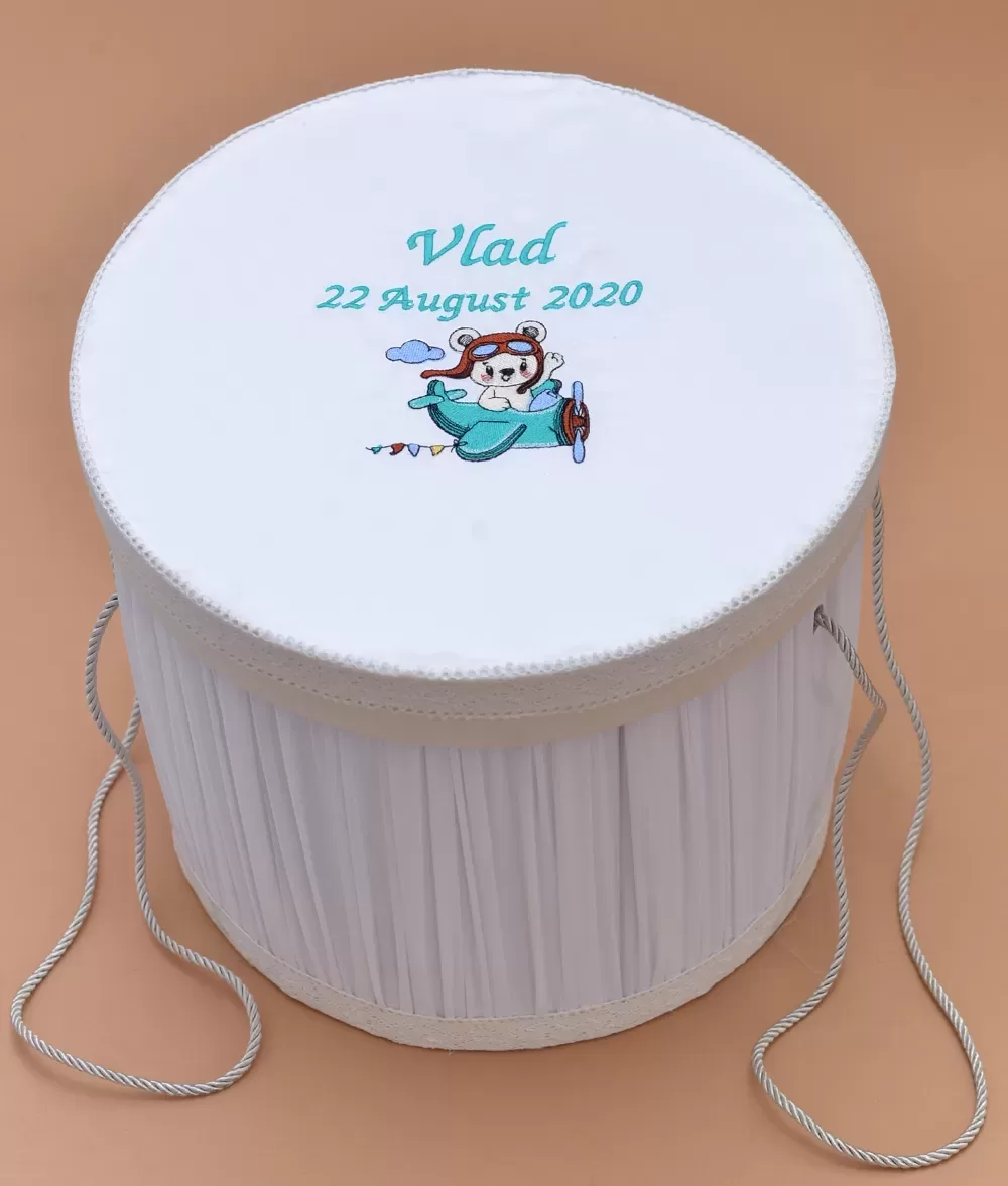 Cutie trusou ursulet in avion personalizata pentru transportul trusoului bebelusului de acasa la biserica by Couture Bebe.