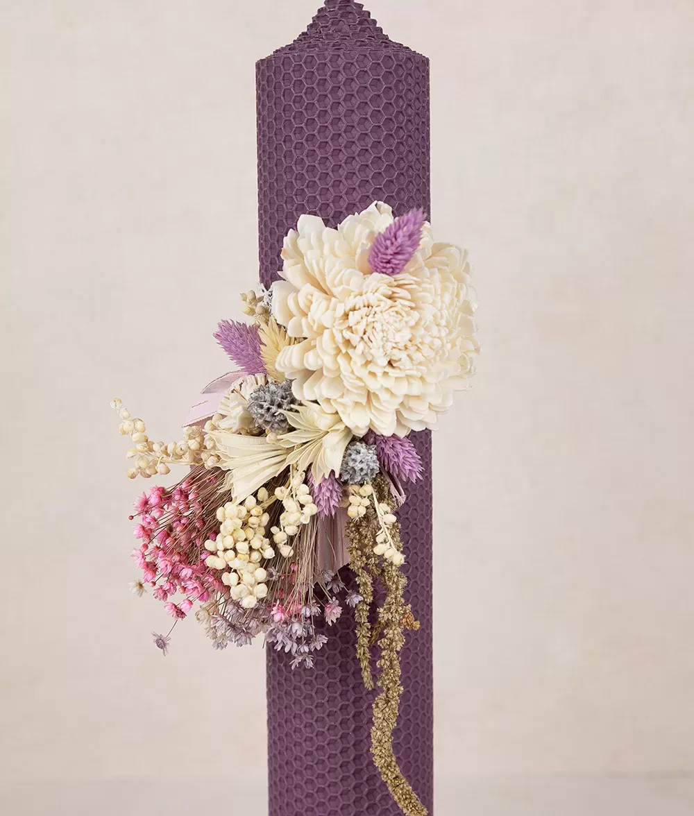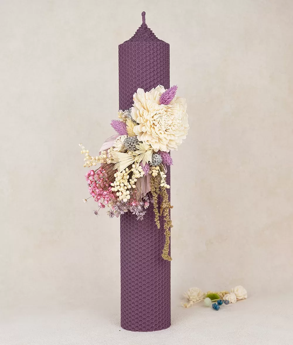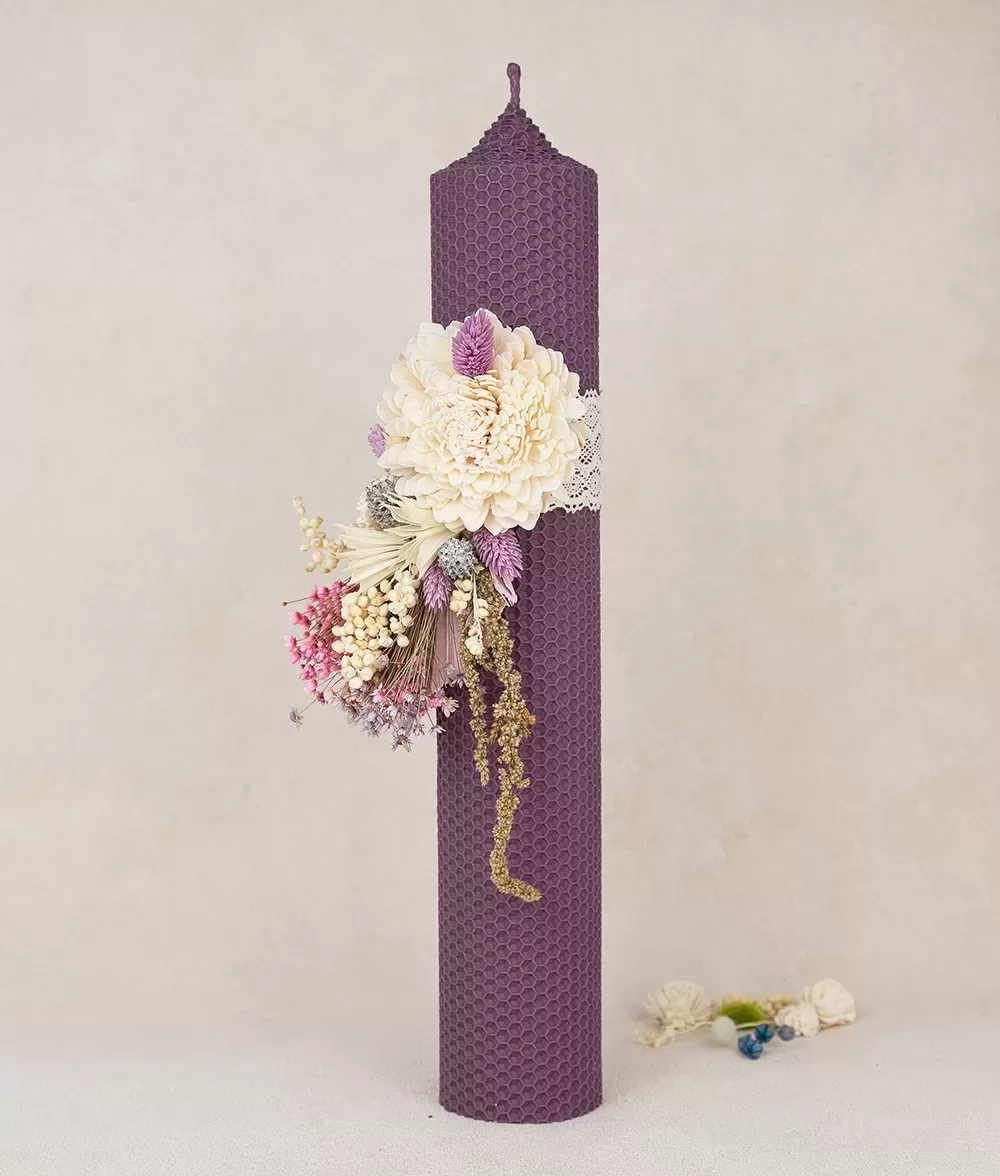 Celebrați un moment special cu o lumânare de botez fagure, realizată din ceara naturală de albine. Aceasta lumânare are un aspect minunat, luxos, ca al unui fagure de albine, simbol al naturii și al creșterii, decorată și accesorizată manual. Parfumată cu esențe naturale, lumânarea arde curat și emite o lumină caldă și relaxantă. Oferiți un amintire durabilă și plină de semnificație cu lumânarea de botez fagure mov Couture Bebe
