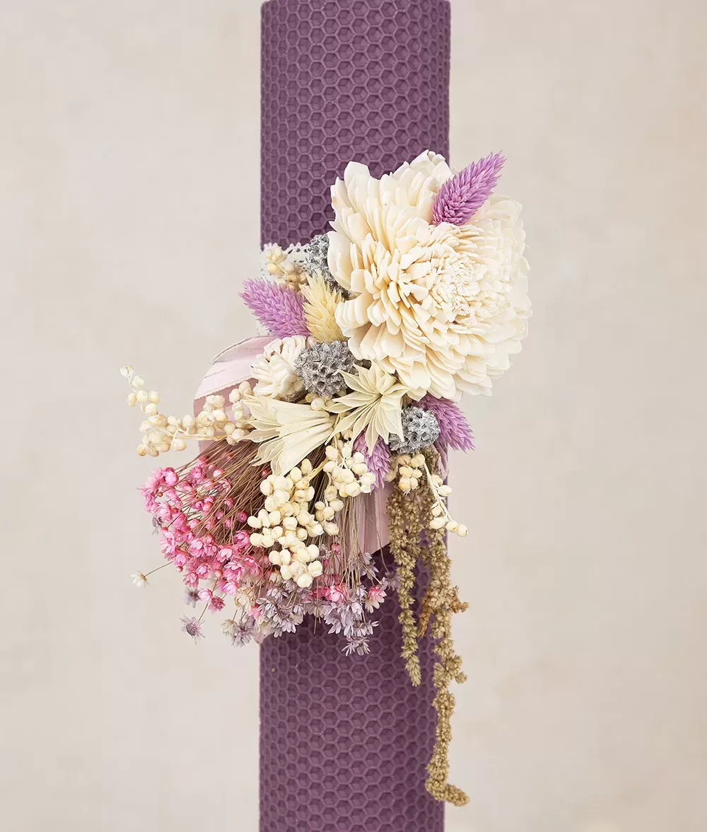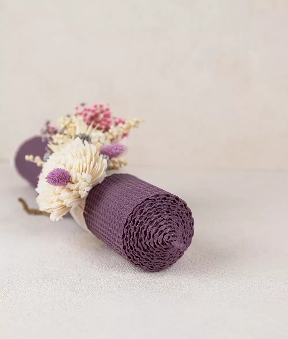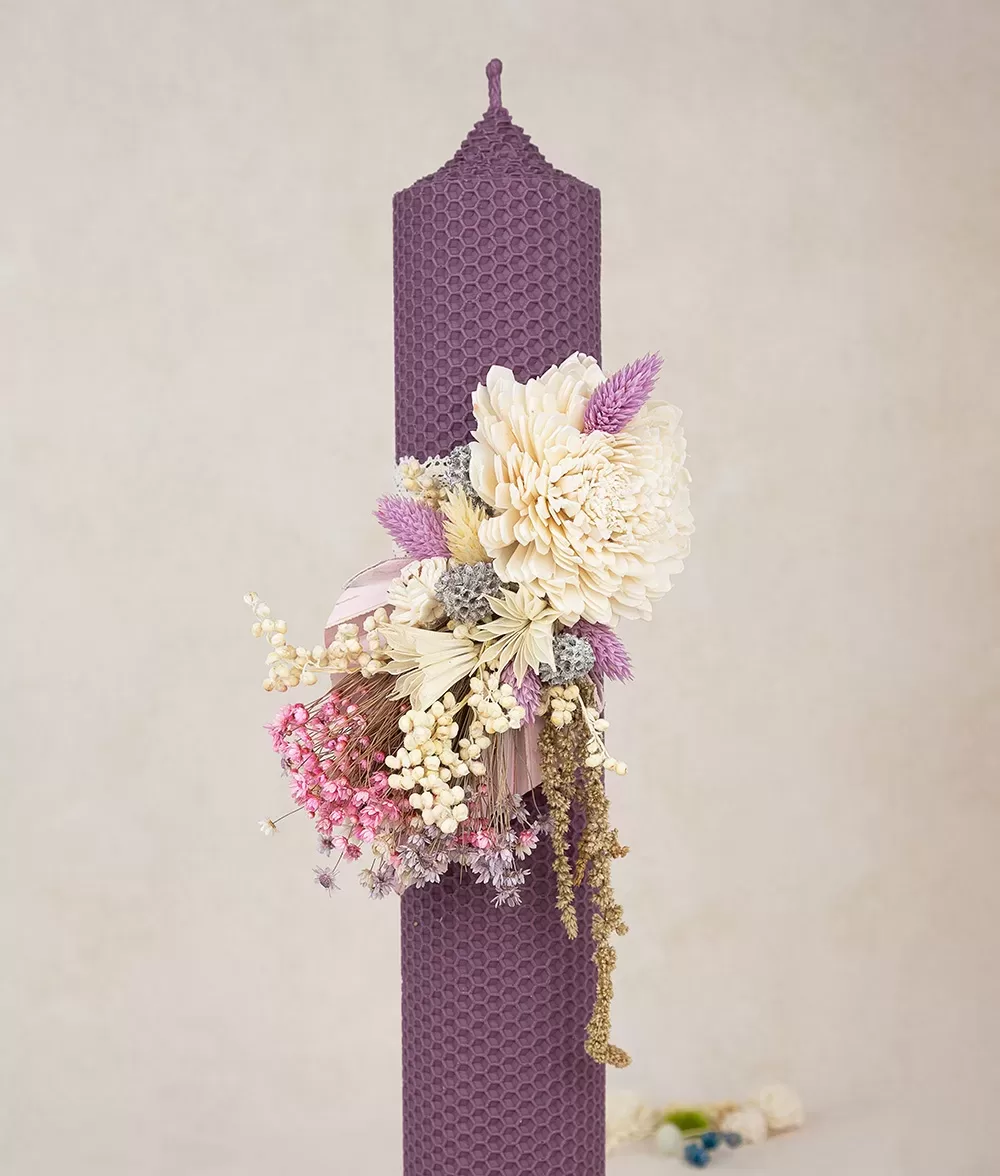 Celebrați un moment special cu o lumânare de botez fagure, realizată din ceara naturală de albine. Aceasta lumânare are un aspect minunat, luxos, ca al unui fagure de albine, simbol al naturii și al creșterii, decorată și accesorizată manual. Parfumată cu esențe naturale, lumânarea arde curat și emite o lumină caldă și relaxantă. Oferiți un amintire durabilă și plină de semnificație cu lumânarea de botez fagure mov Couture Bebe