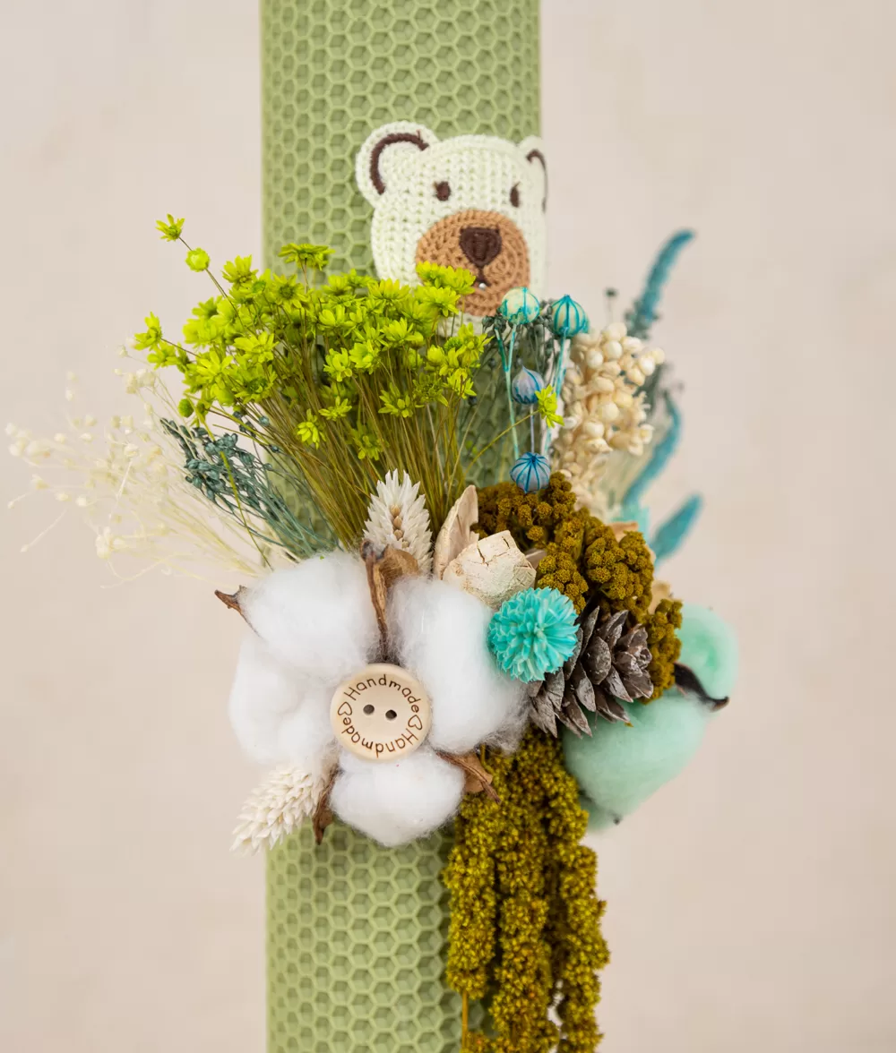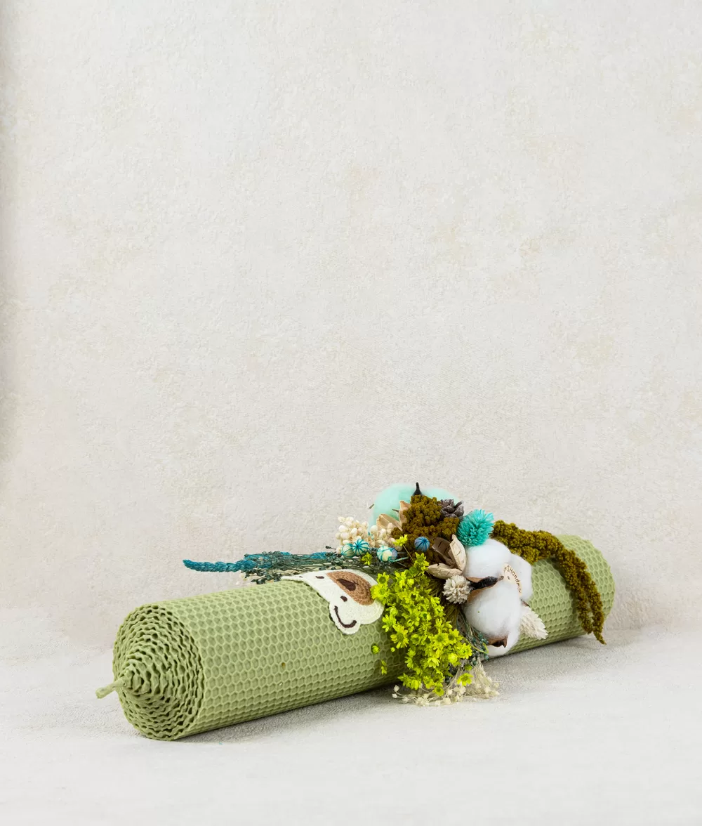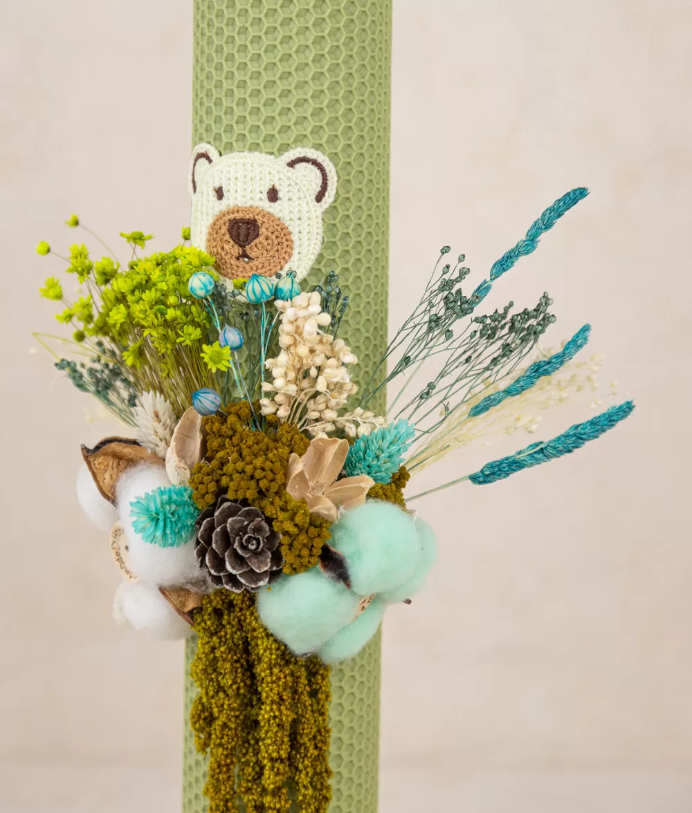 Lumânarea de botez fagure verde olive este un obiect decorativ unic, care poate fi realizat la comandă în mai multe combinații de culori și materiale, astfel încât să se potrivească perfect cu tema și stilul evenimentului dumneavoastră.