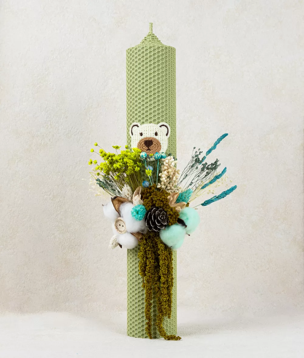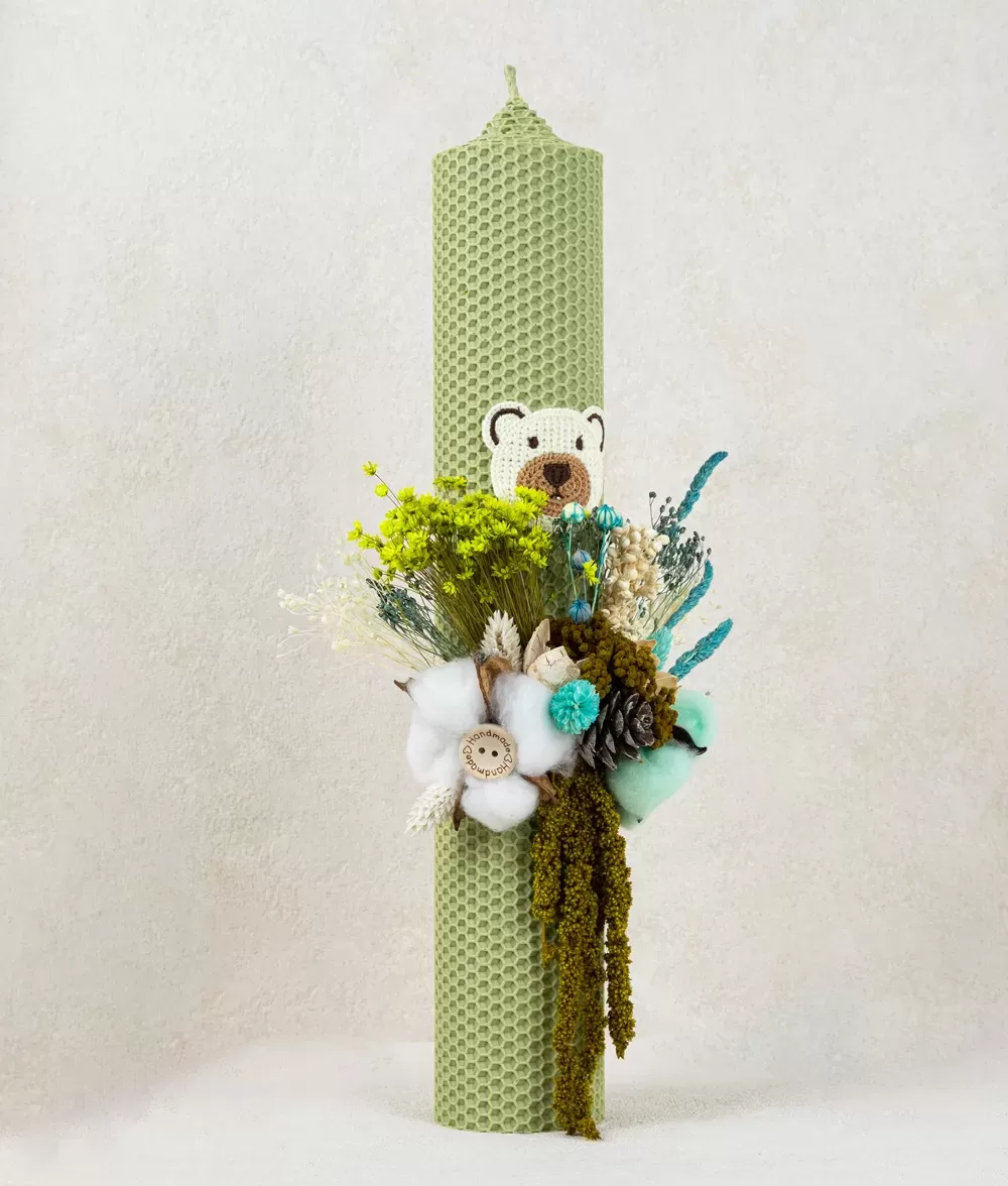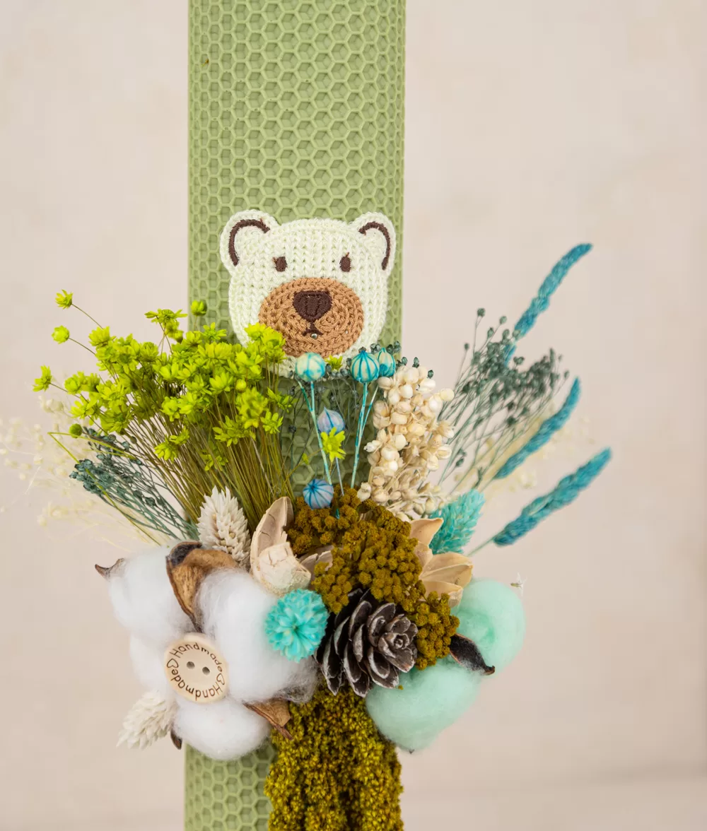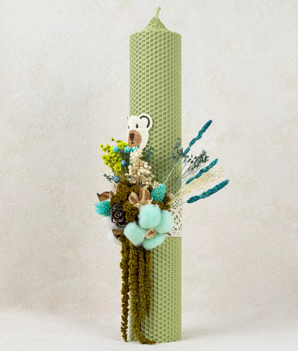 Lumânarea de botez fagure verde olive este un obiect decorativ unic, care poate fi realizat la comandă în mai multe combinații de culori și materiale, astfel încât să se potrivească perfect cu tema și stilul evenimentului dumneavoastră.