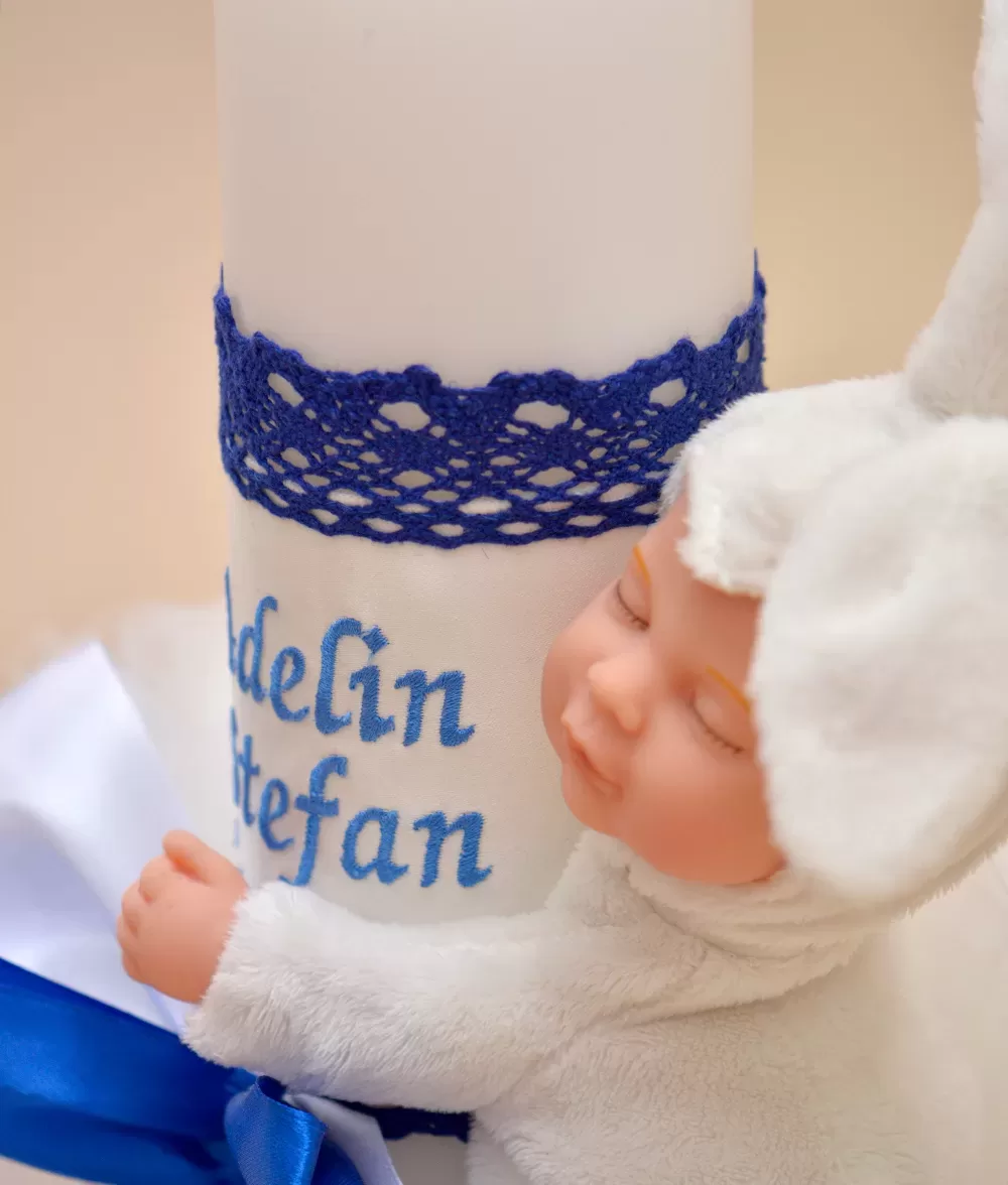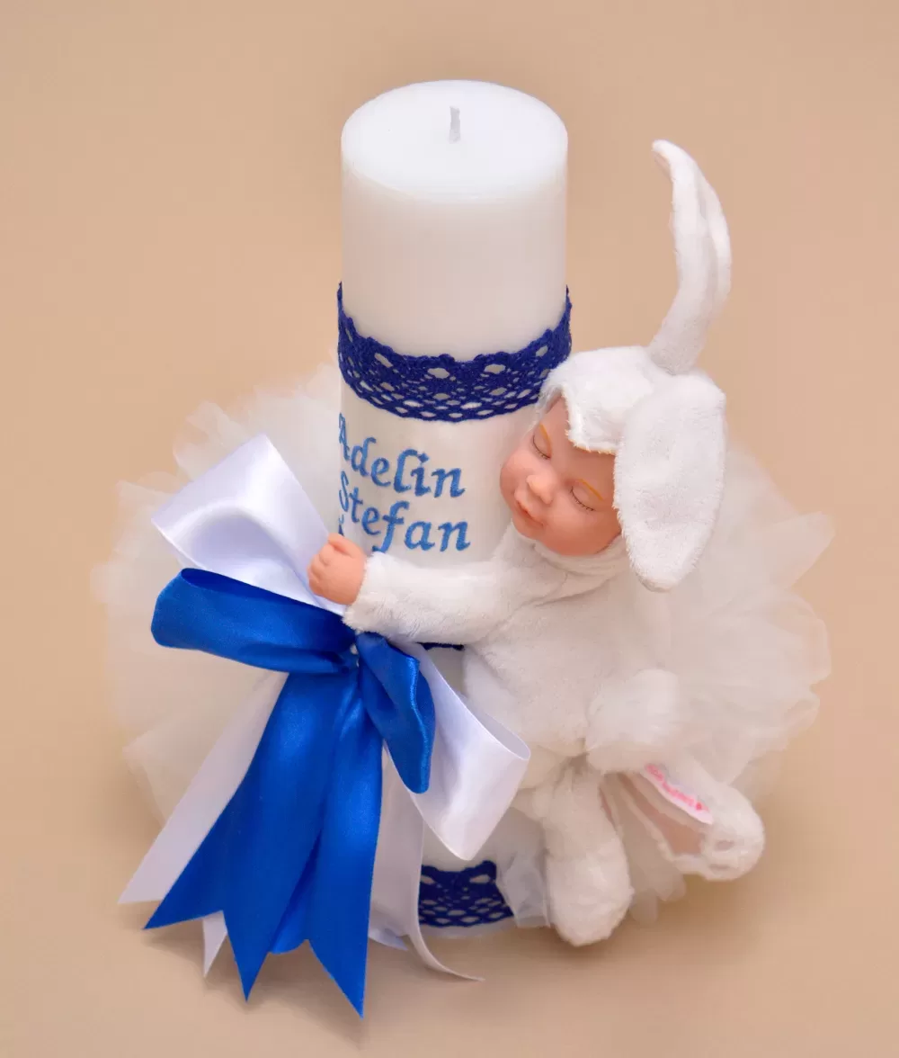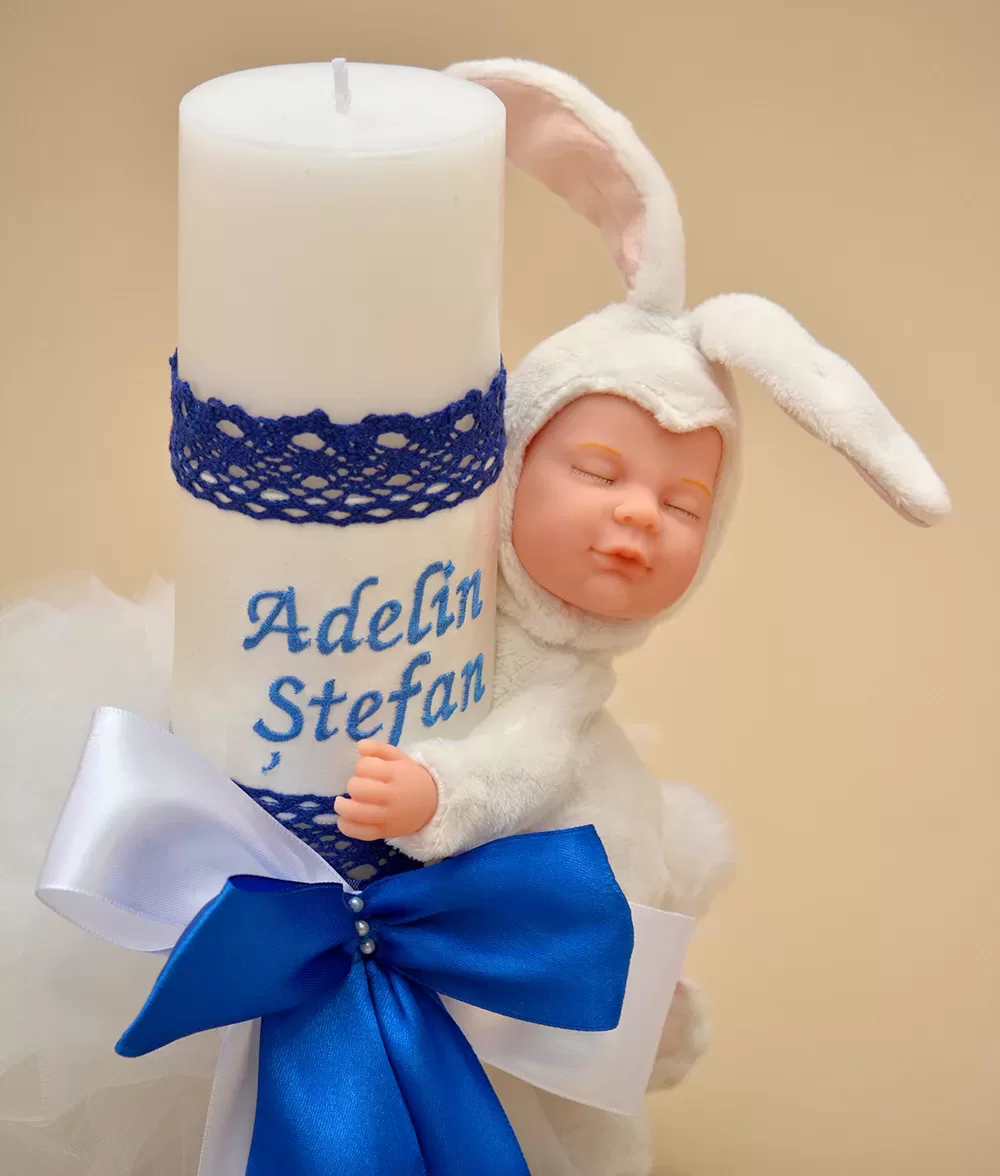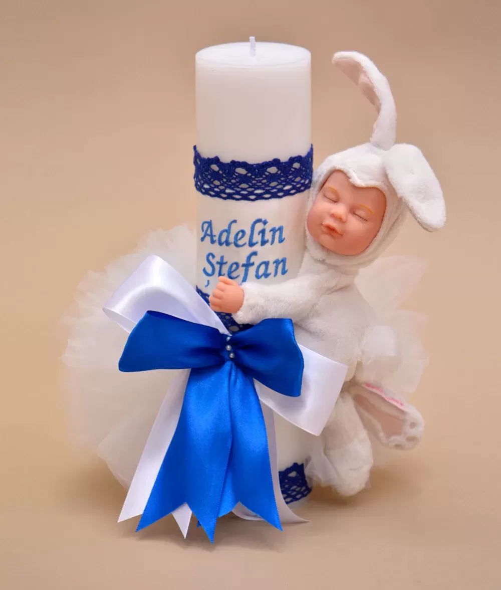 Lumanare de botez din ceara naturala imprimata si accesorizata cu jucarie Iepuras
