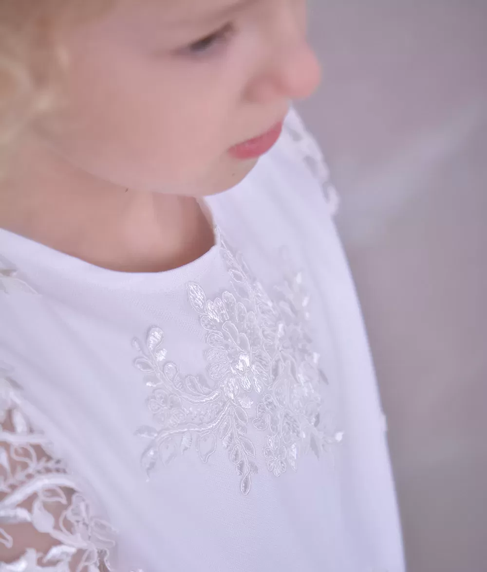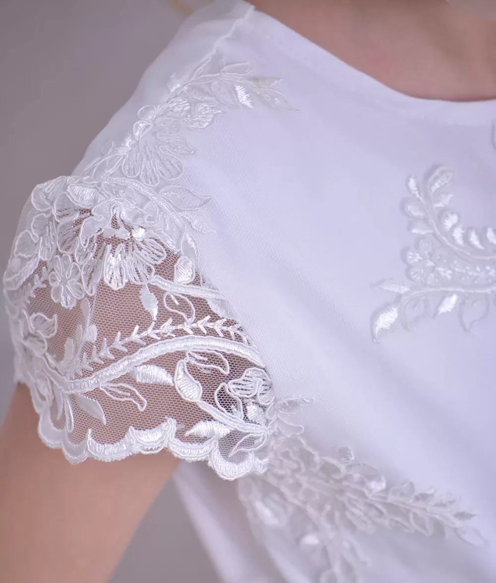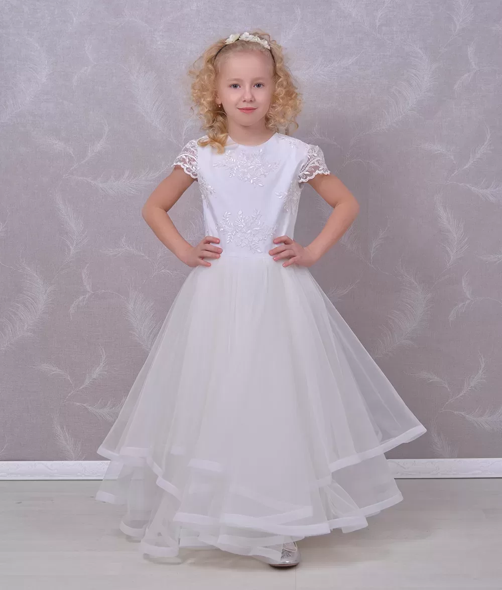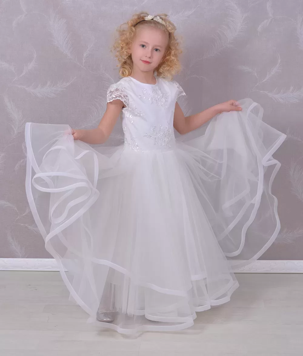 Rochie spectaculoasa realizata din dantela brodata cu model floral si fusta din tull. Fusta este compusa din straturi suprapuse de tull fin pentru volum si un efect spectaculos