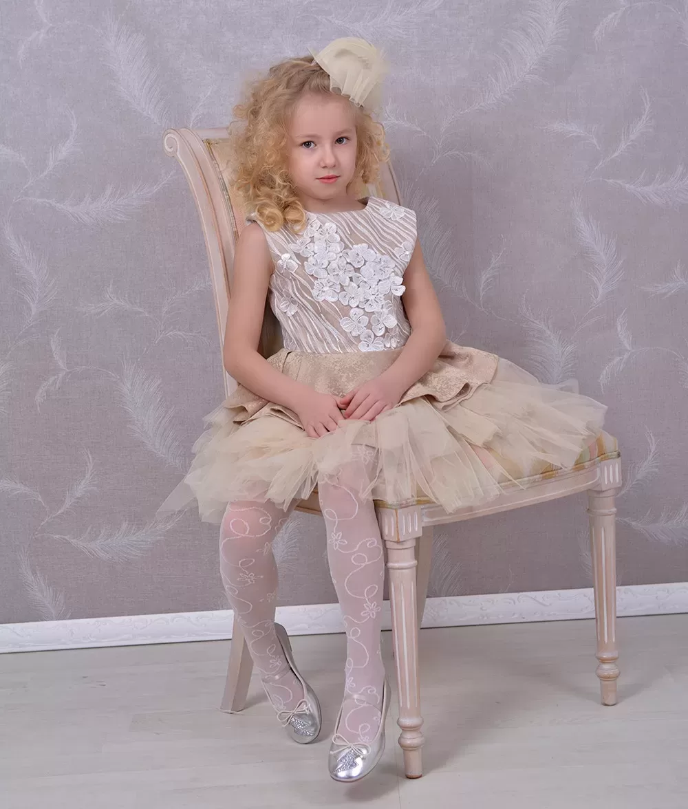 Rochie spectaculoasa realizata din dantela 3D cu model floral si fusta din tull. Fusta este compusa din straturi de tull si brocard.