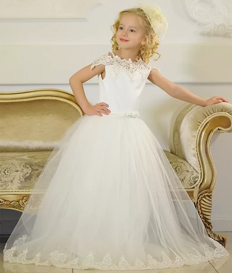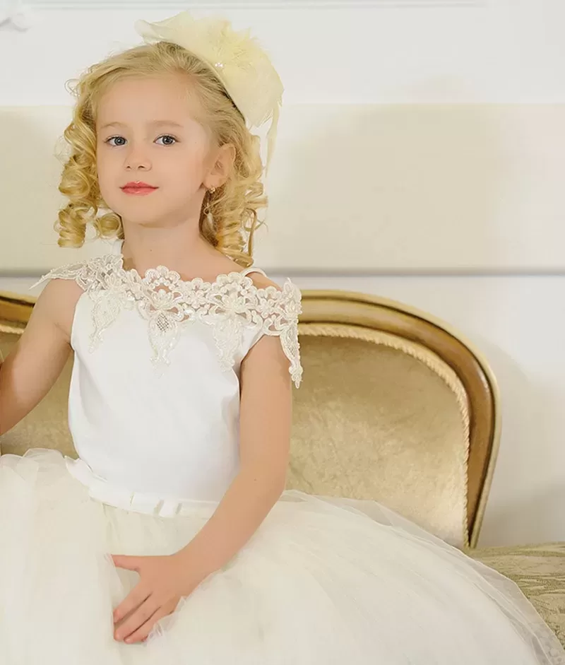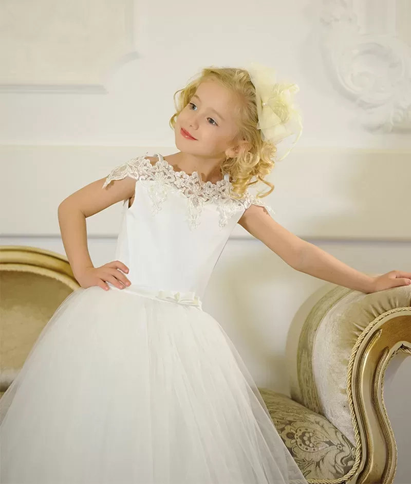 Rochie superba cu bustul din bumbac satinat si fusta ampla din tull moale, rochia este accesorizata la gat si pe fusta cu dantela brodata cu cristale.