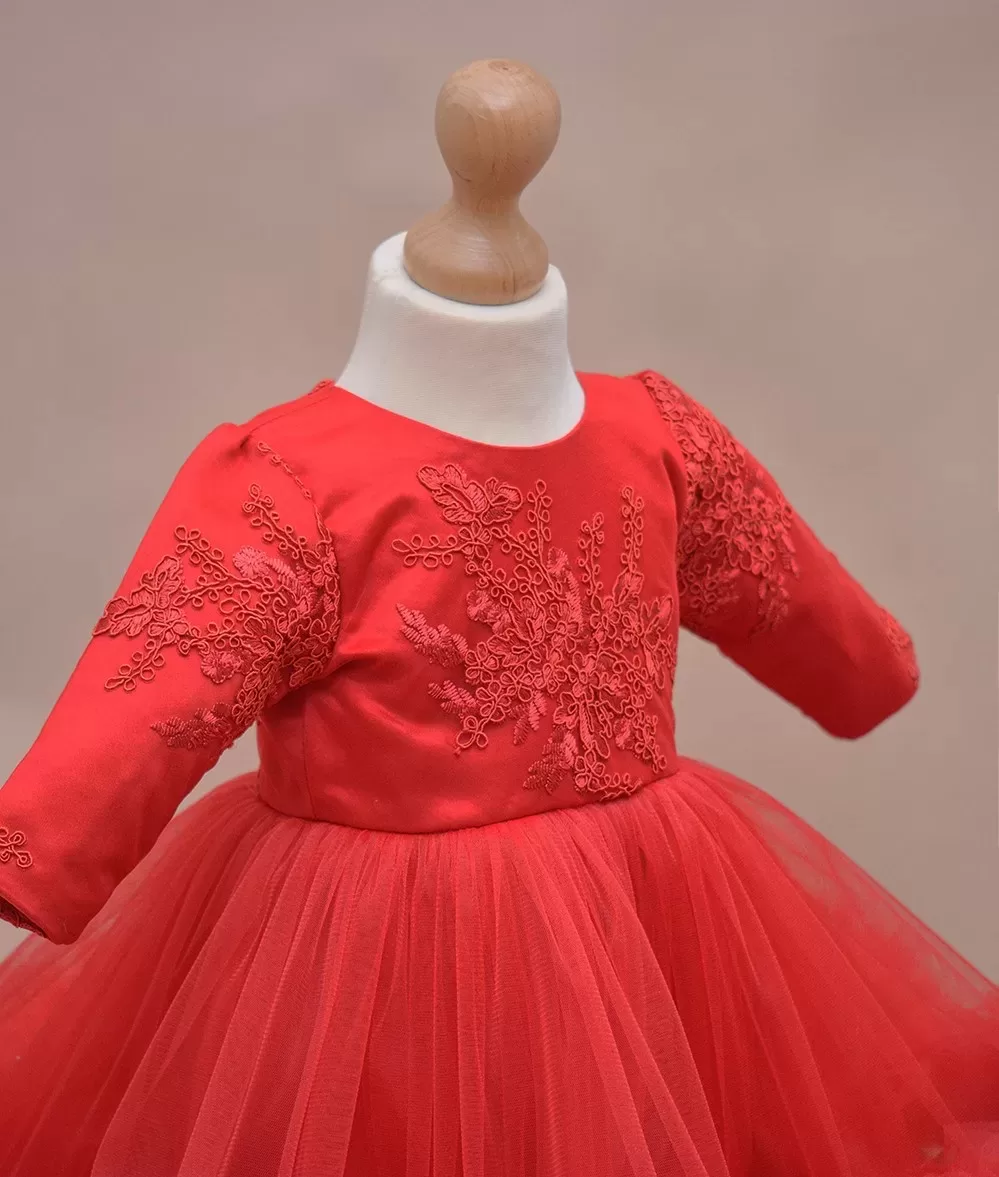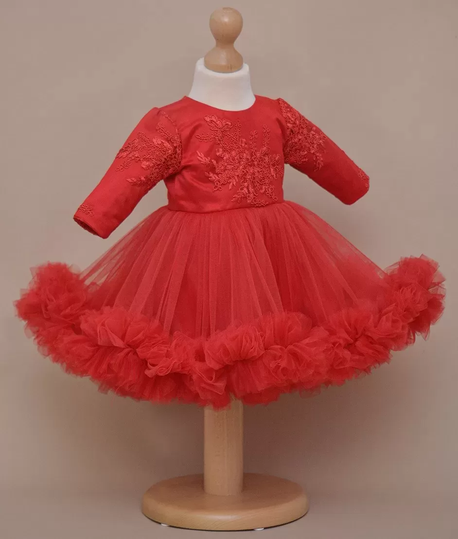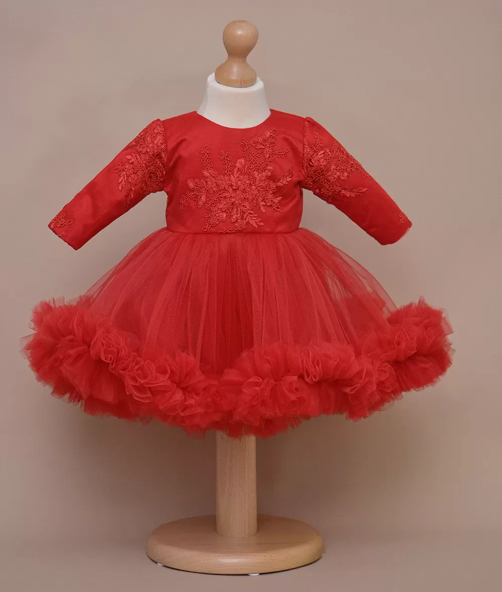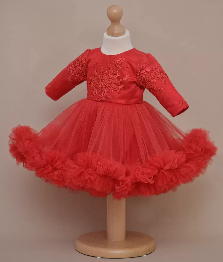 Rochie de botez spectaculoasa din dantela brodata si tull fin cu volan supradimensionat pe fusta