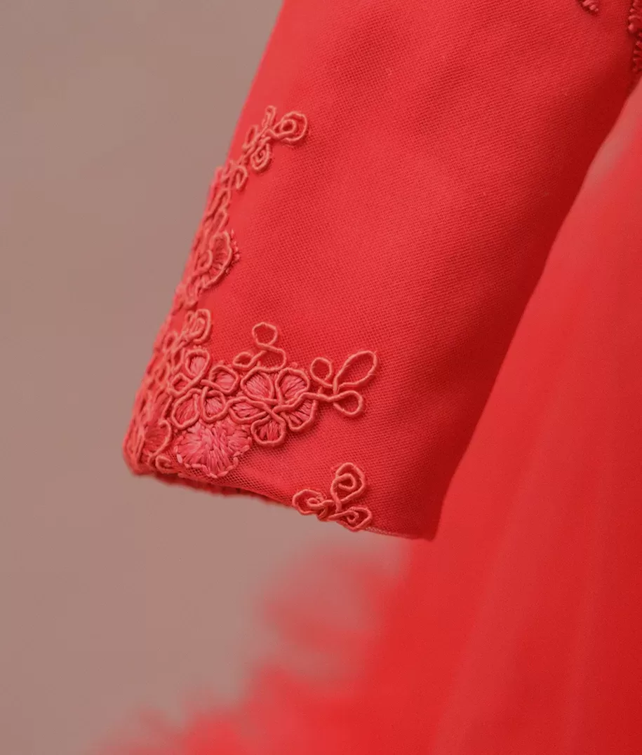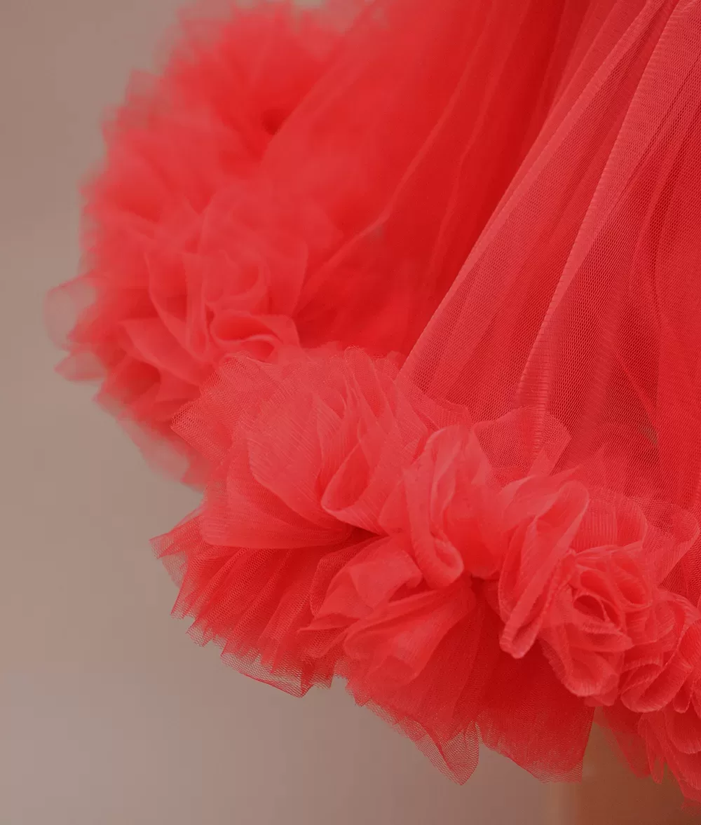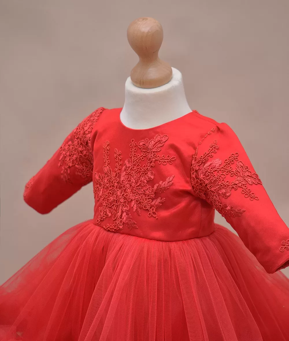 Rochie de botez spectaculoasa din dantela brodata si tull fin cu volan supradimensionat pe fusta
