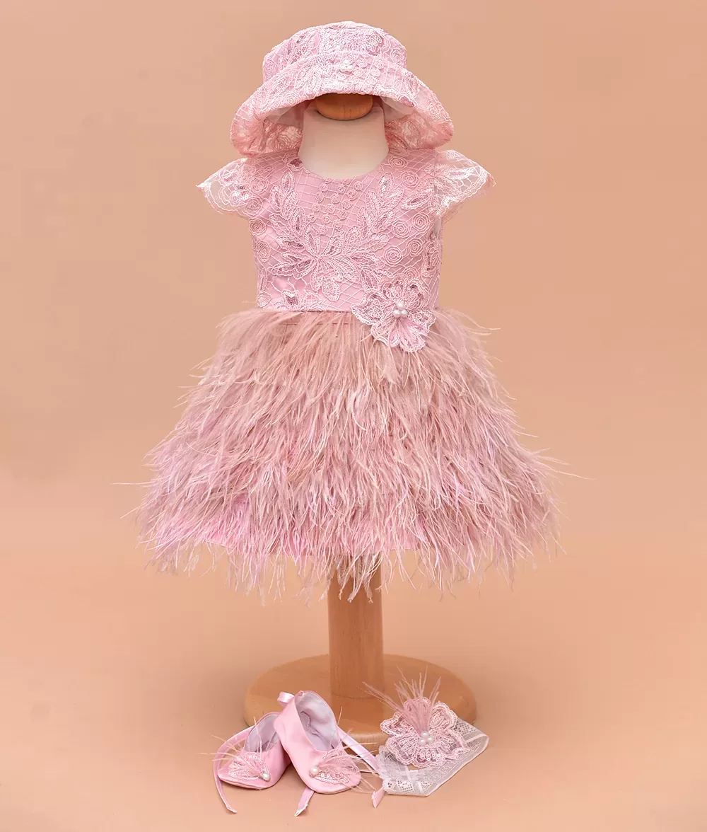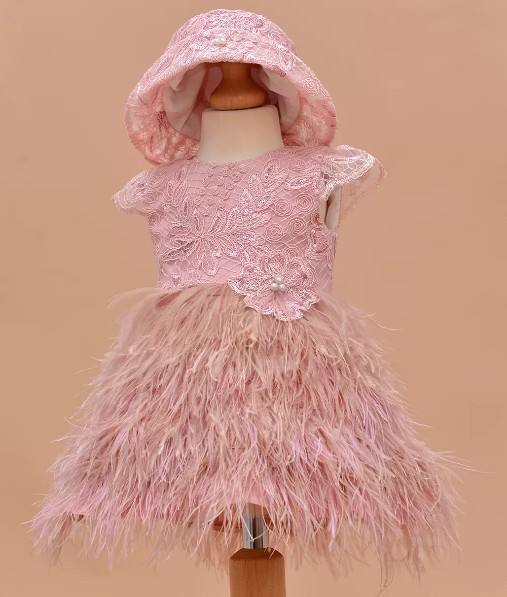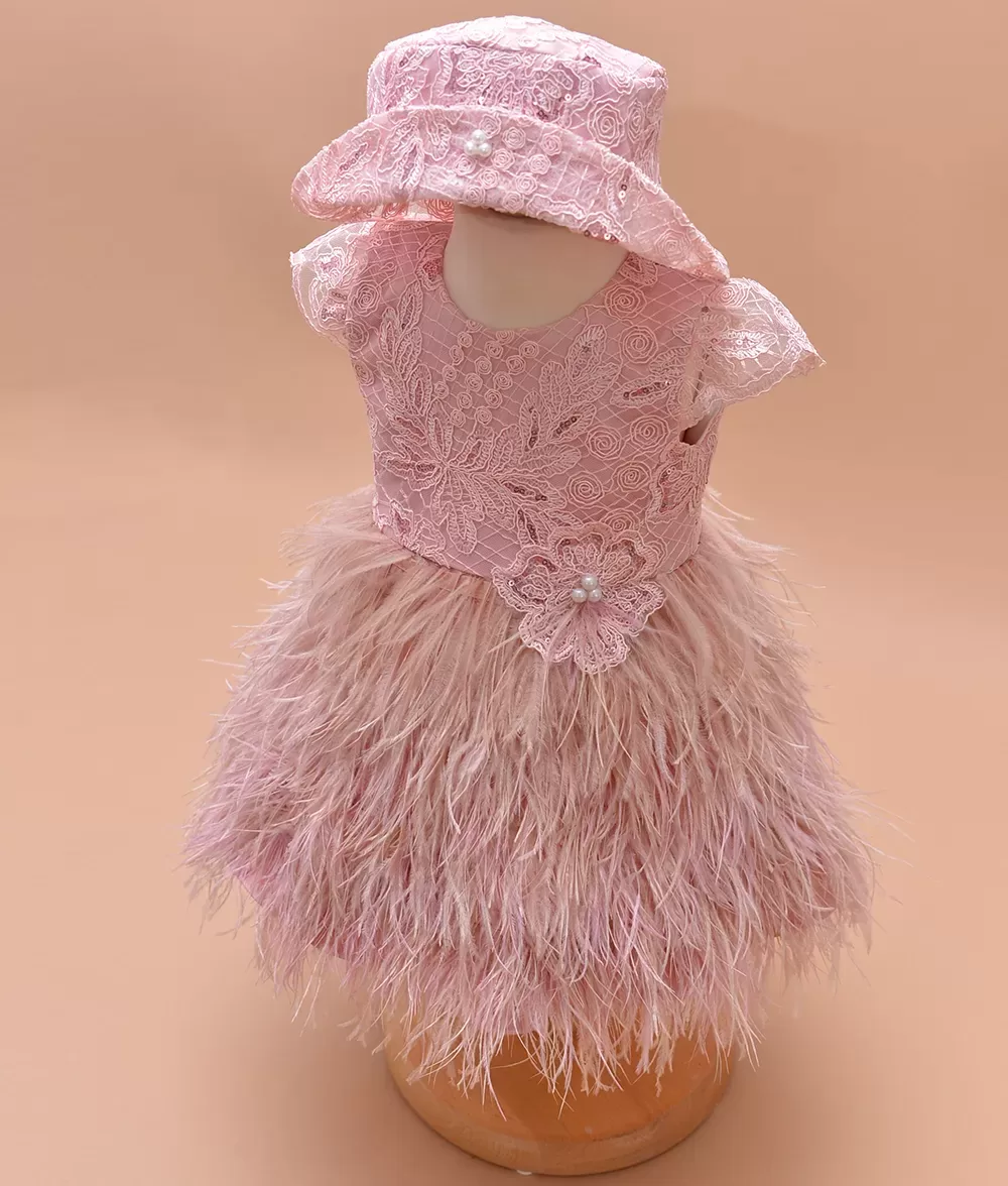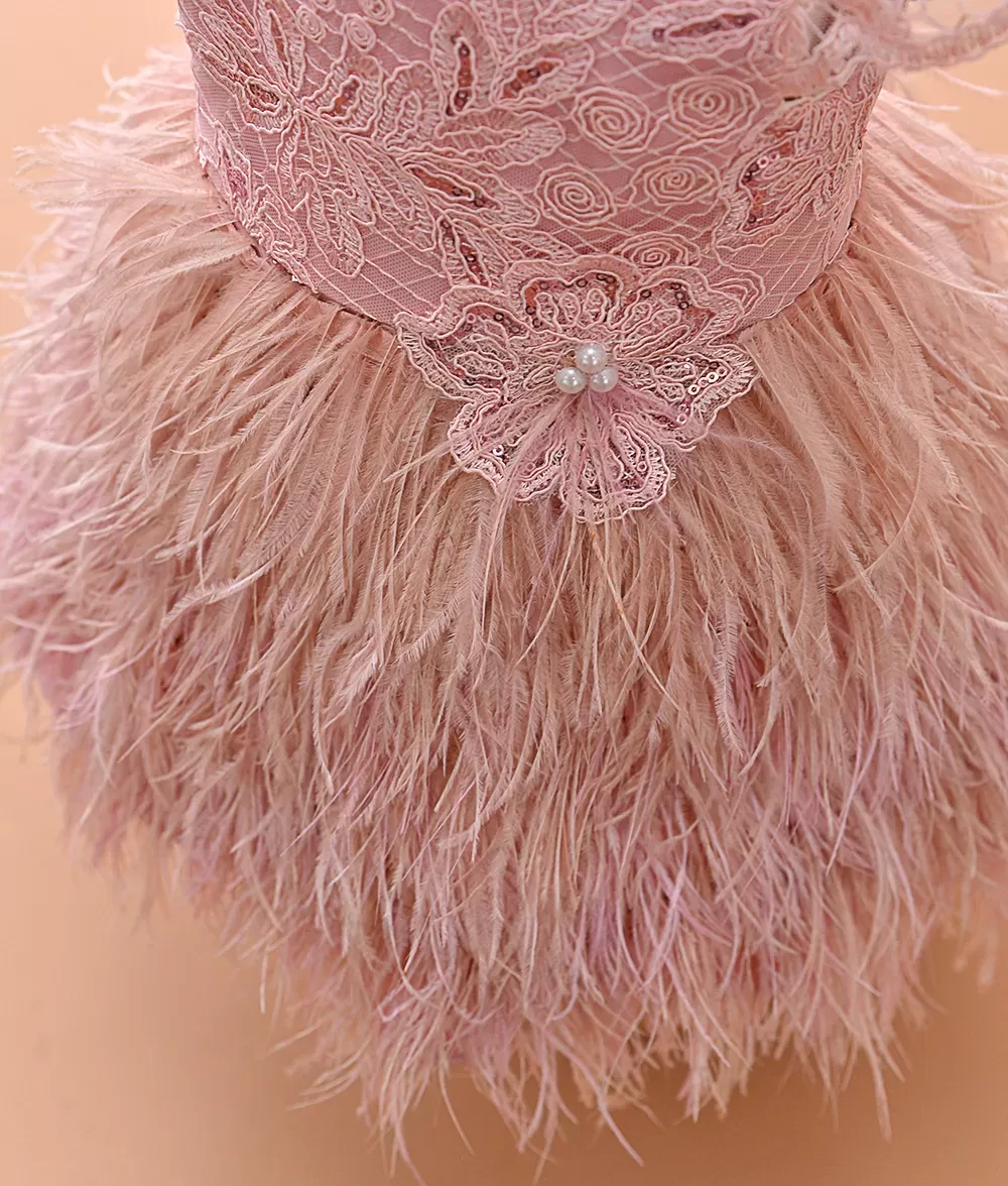 Rochita botez couture din dantela roz si pene de strut roz in degradee