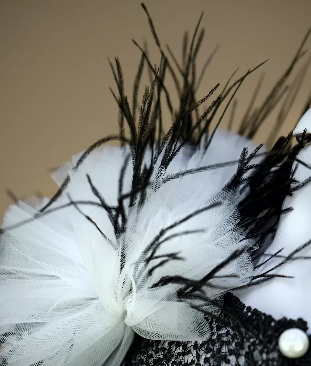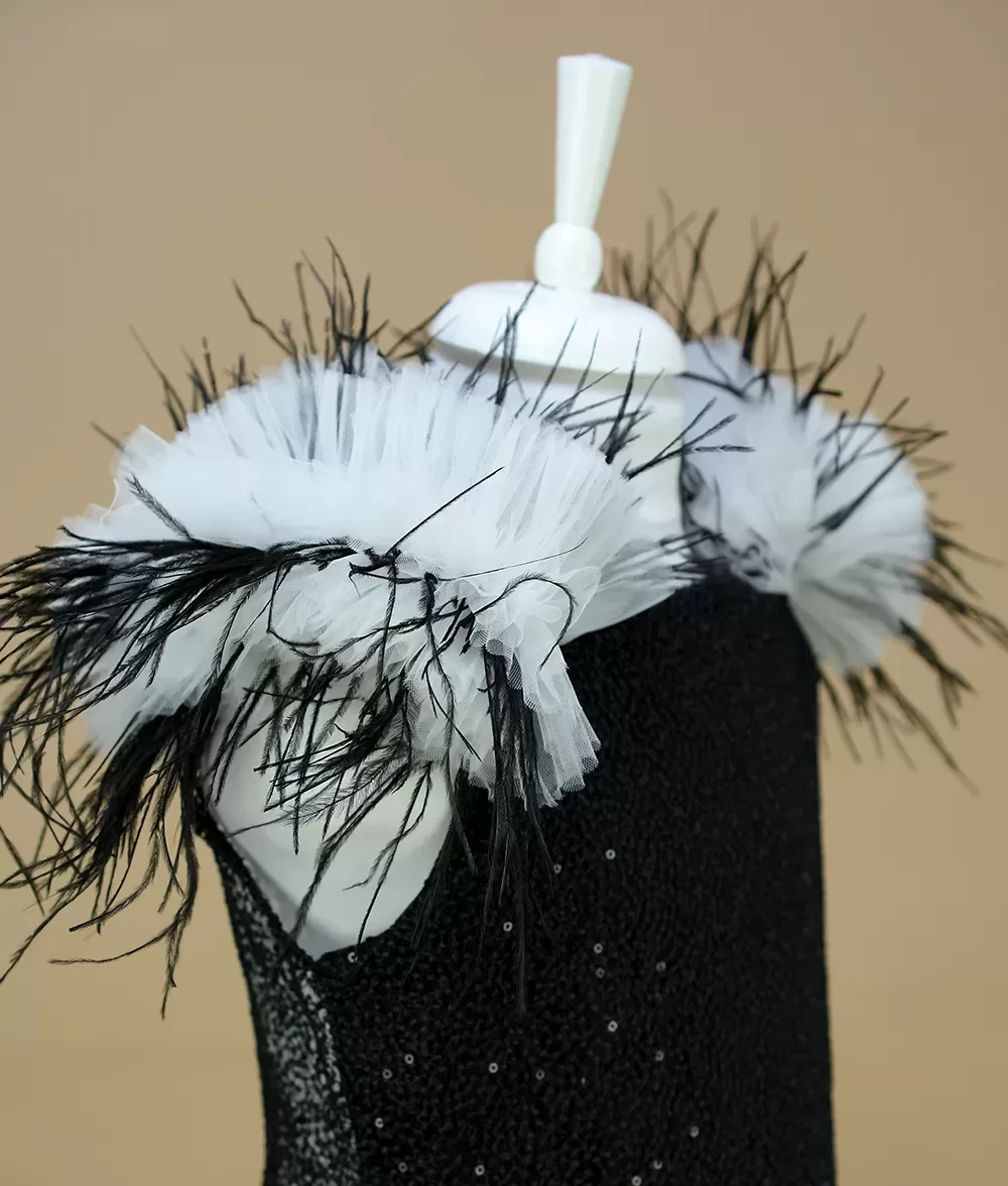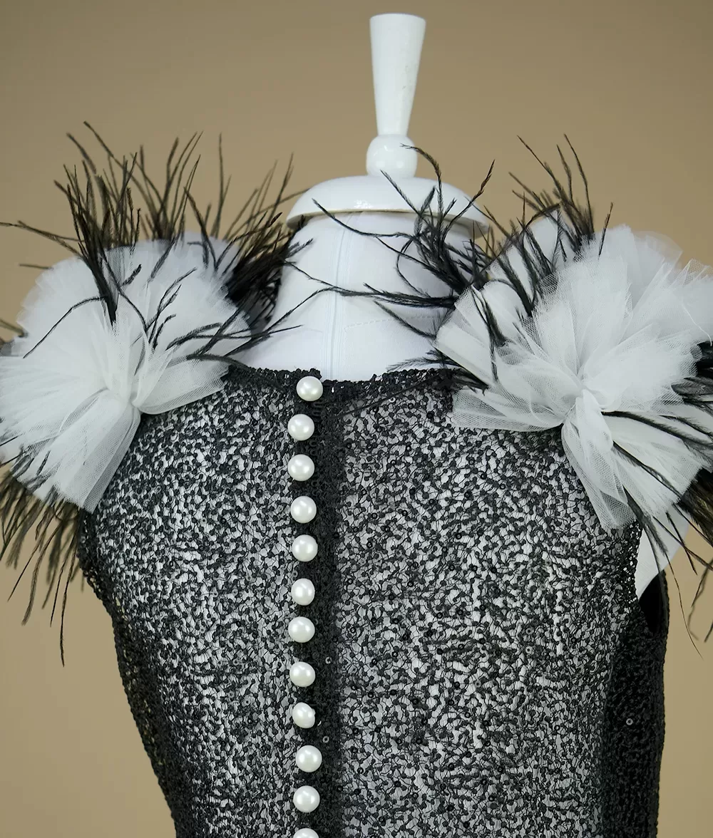 Rochita cu trena din tull este un model care straluceste si impresioneaza prin croi si accesorizare. Fusta din tull cu trena este accesorizata cu banda din catifea, bustul este din dantela tip spider cu micropaiete discrete si are ca element decorativ tull si pene de strut pe umar, spatele este accesorizat cu nasturei tip perla. Micuta vedeta care o poarta o sa se simta confortabil si comod in ea pentru ca rochia este dublata integral cu bumbac. Inchiderea acestui model se face cu bride pe lungimea spatelui.