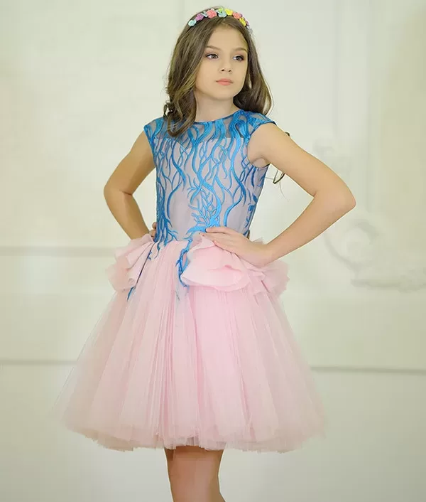 O rochie superba din dantela turcoaz si tull moale accesorizata cu serpisori din dantela cusuti manual pe fusta si melci din tull in talie.