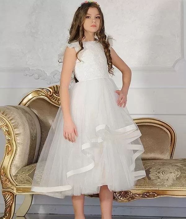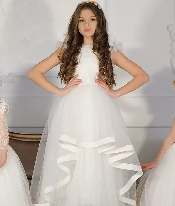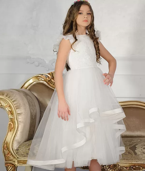 Rochie spectaculoasa din dantela fina si fusta din tull. Rochia are bordura din rijelina imbracata in tafta si capacele din tull la maneca, spatele este gol in forma de inima si se inchide cu trei nasturei perlute in partea superioara.