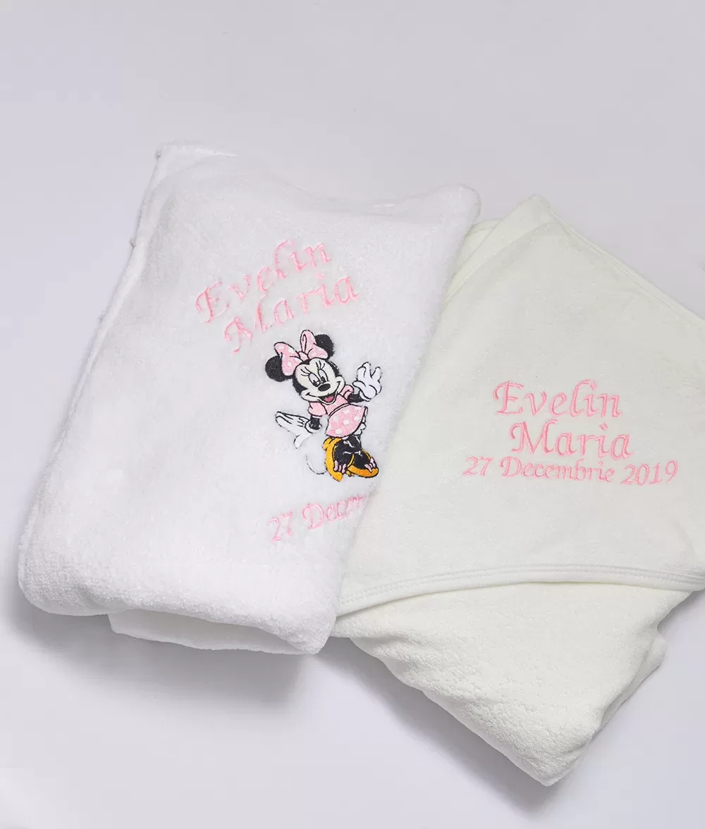 - Prosop de baie de calitate superioara 100% bumbac – 70 x 140 cm sau prosop cu capison 90 x 90 cm personalizat prin broderie, panza de mir netivită ( Crâşnă ), fasa
